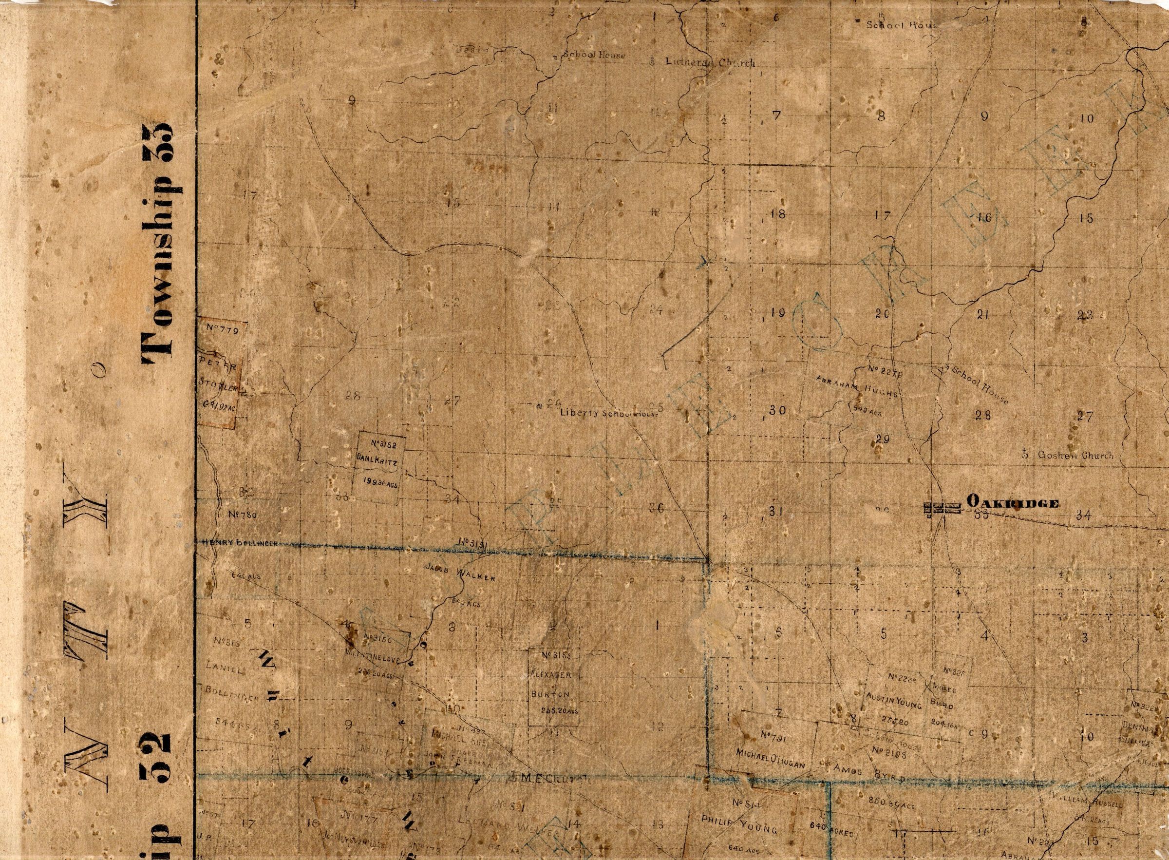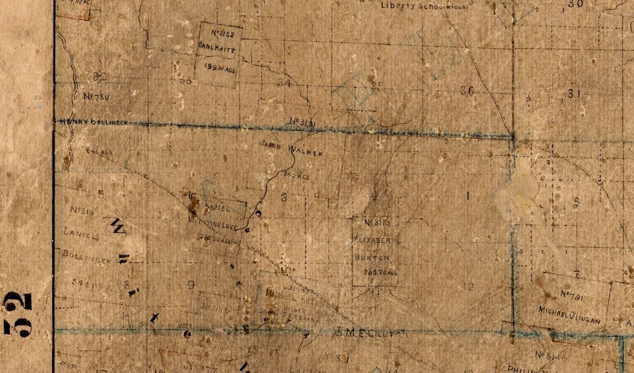 James Brooks Cape County map from 1870 which faintly shows the Jackson to Fredericstown road coming from Millersville to the edge of Cape County, a part of the Hildebrand trail; Enhanced image of portion of 1870 James Brooks map with green dots representing the Jackson to Fredericktown road on the Hildebrand route; Marked and enhanced image of the Northern Route as it passes through Henry Bollinger's #780 land grant on the Brooks Cape County map, with a red circle clearly indicating the route.
