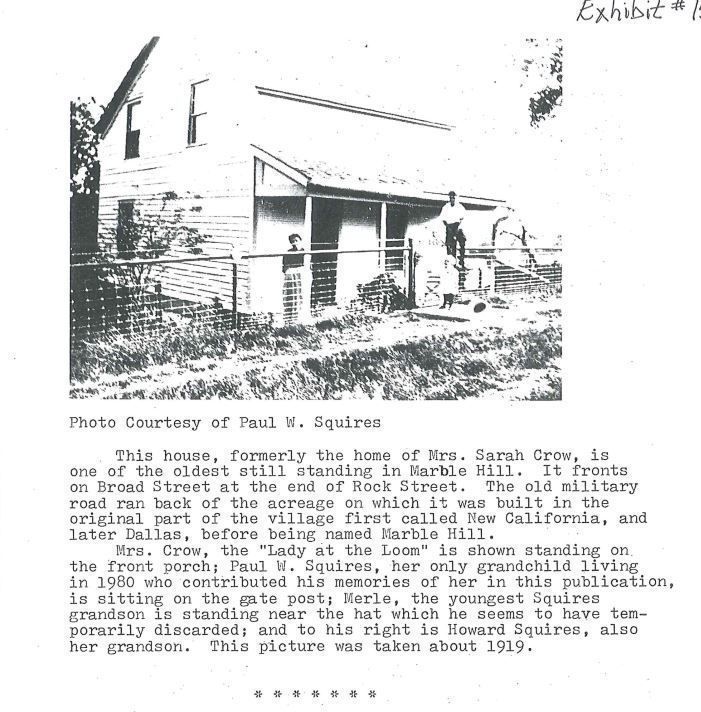 Scan of photograph and caption showing the Crow house, formerly owned by Mrs. Sarah Crow, pictured here with her grandsons Paul and Howard Squires. This house was one of the oldest structures still standing in Marble Hill on Broad street and Rock street, and it the old military road (Benge route) would have run nearby this property.Photograph Details