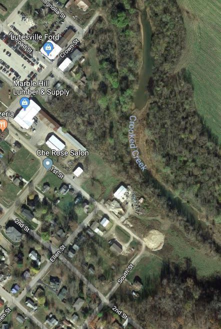 Satellite image of aerial view of modern day Marble Hill showing the ford in Crooked Creek used in 1838 (and the Lutes house in the same location as recorded in 1837 state survey.)Acquisition