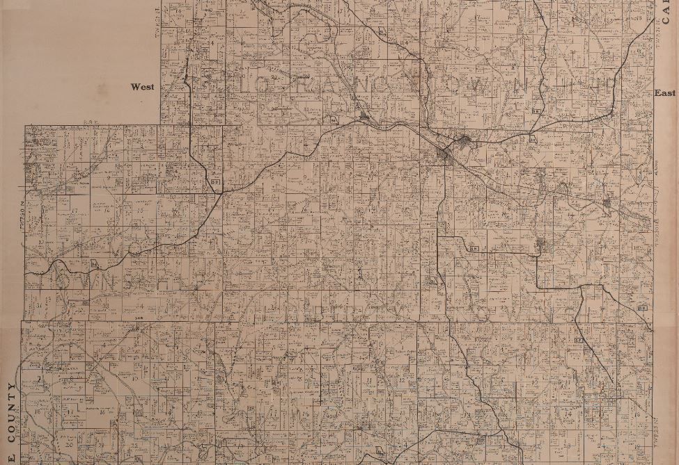 Mid portion of Bollinger County Plat map from 1906 showing how HWY 34 ran in 1906, going all the way to the county line.Acquisition