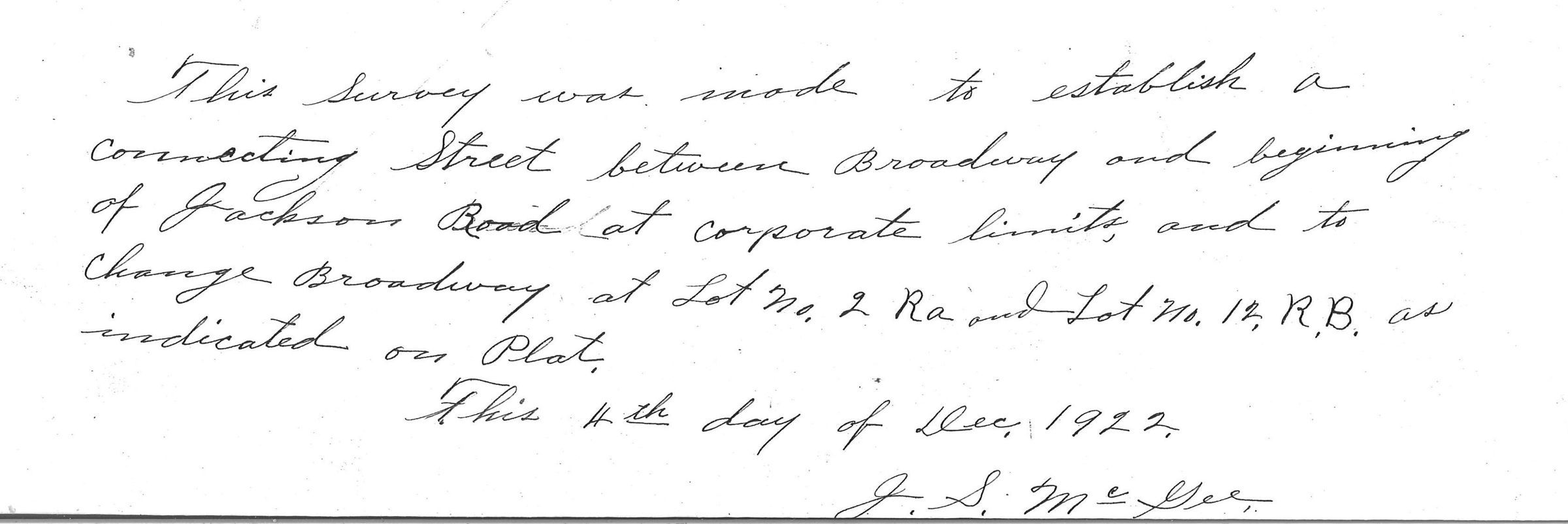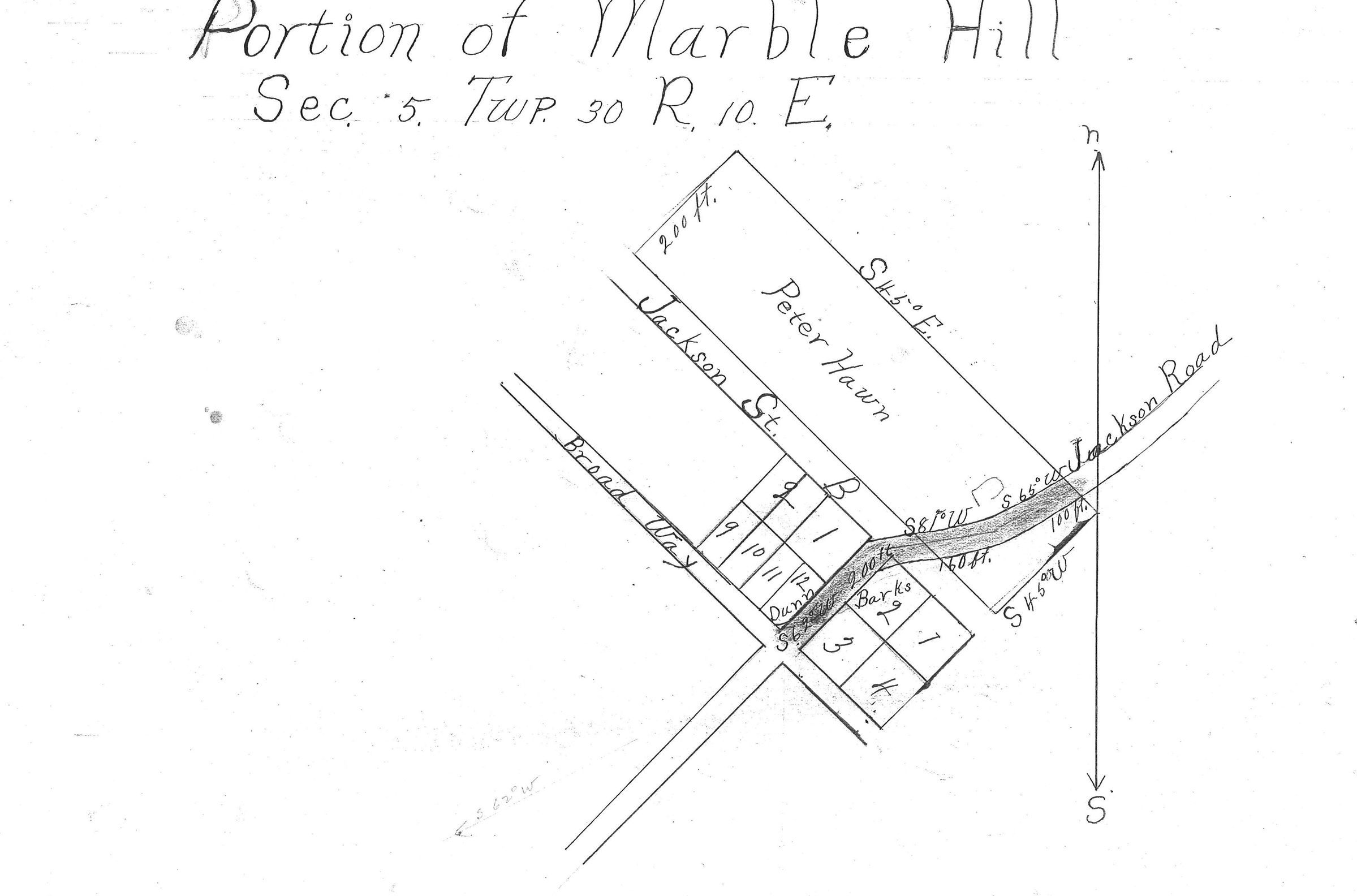 Survey of a portion of Marble Hill (Sec. 5 Twp 30 R 10 E) done in Dec. 1922 to, as the inscription reads, "establish a connecting street between Broadway and beginning of Jackson Road at corporate limits and to change Broadway at Lot No. 2 Ra and Lot no. 12 R.B. as indicated on Plat." The survey is signed by J.S. McGee. This shows the postal/military road (State Road 34) used as part of the Benge route previously.Acquisition