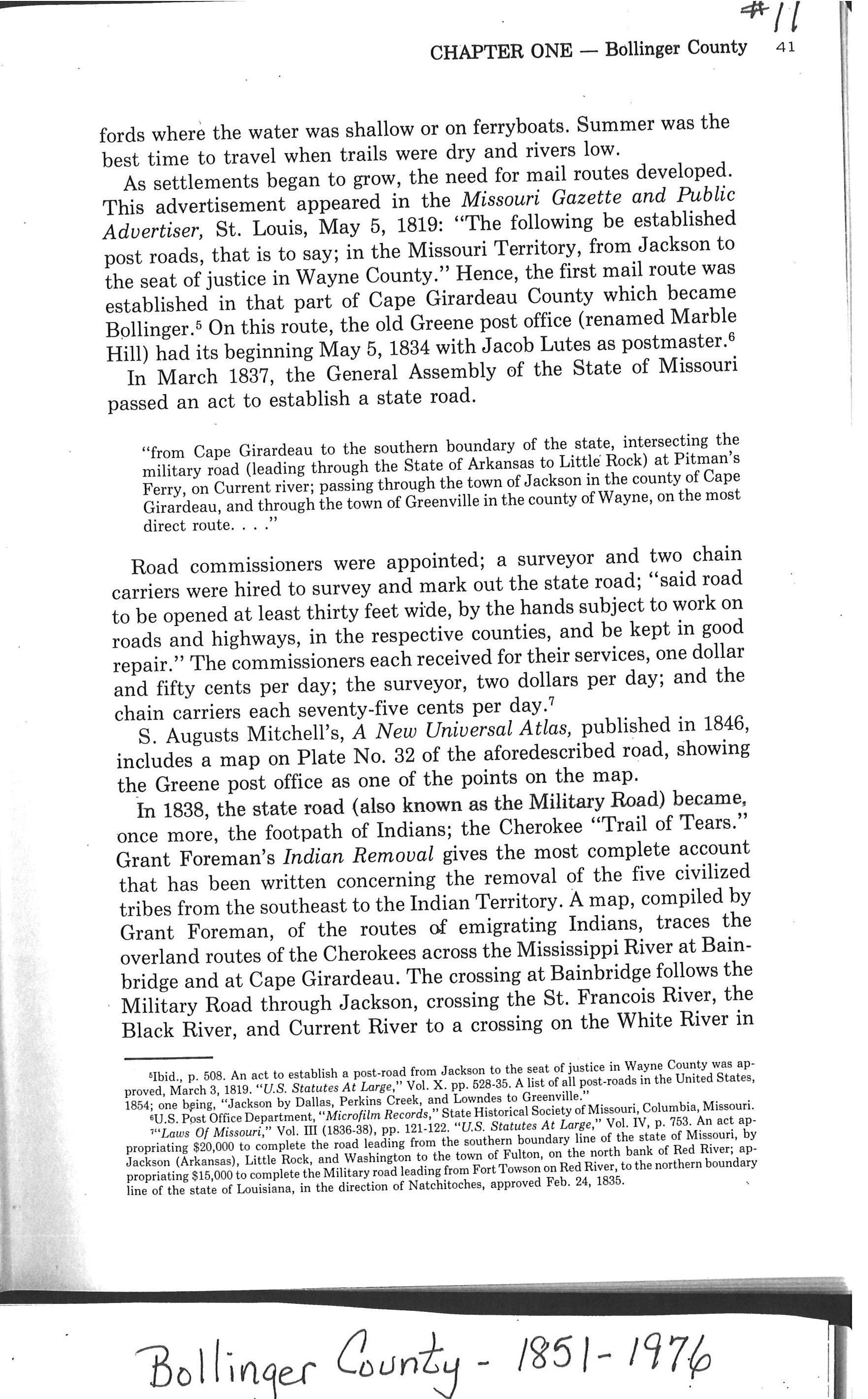 This excerpt from Bollinger County: 1851-1976 describes the history of the first mail route established from Jackson to Wayne County which later became the Military Road transversed by the Cherokee as part of the Benge route. The state road was established in 1837, and in 1838, it was part of the Trail of Tears.Acquisition