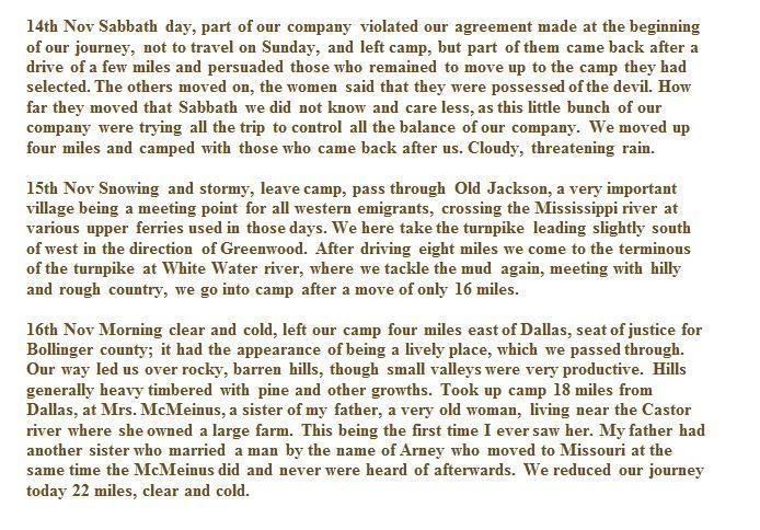 Transcription of journal entries from the Darr Journal detailing their trip across the Benge trail 20 years after BB Cannon's journey. Describes sites such as Old Jackson, Whitewater river, and (now named) Marble Hill were described in the entries on Nov. 14-16th.Acquisition