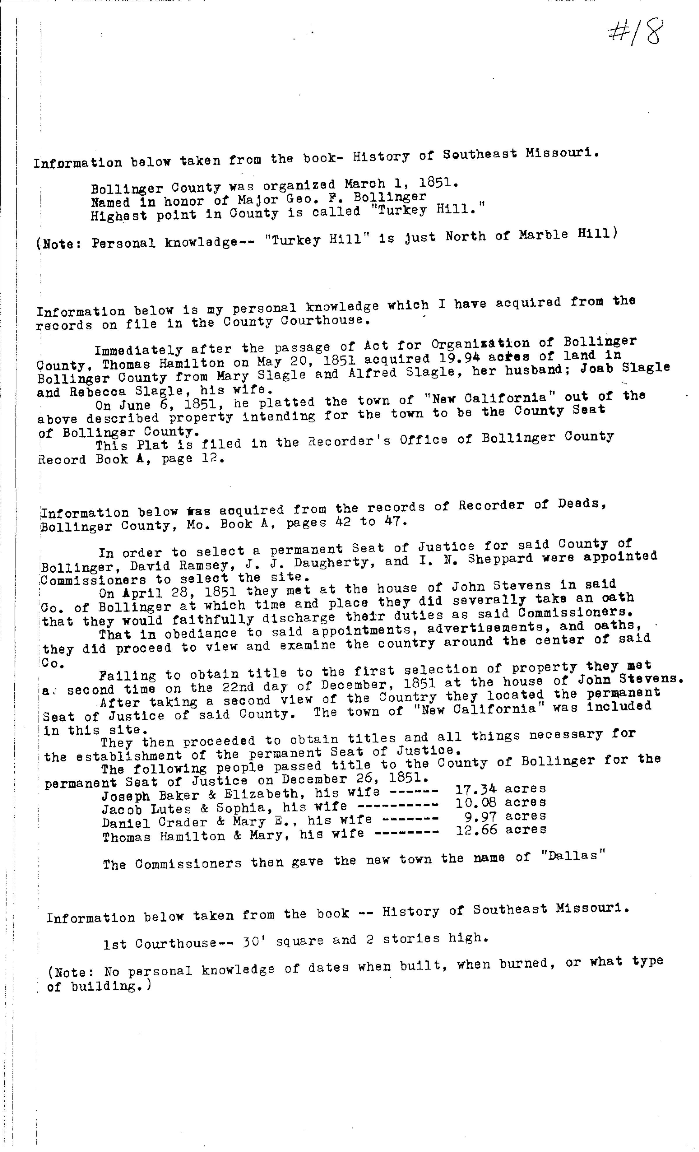 This 2 page excerpt briefly describes the legal founding of Bollinger County and the County seat, presently called Marble Hill. This document is important as is notes where the town originally began, much farther East that present-day Marble Hill.Acquisition