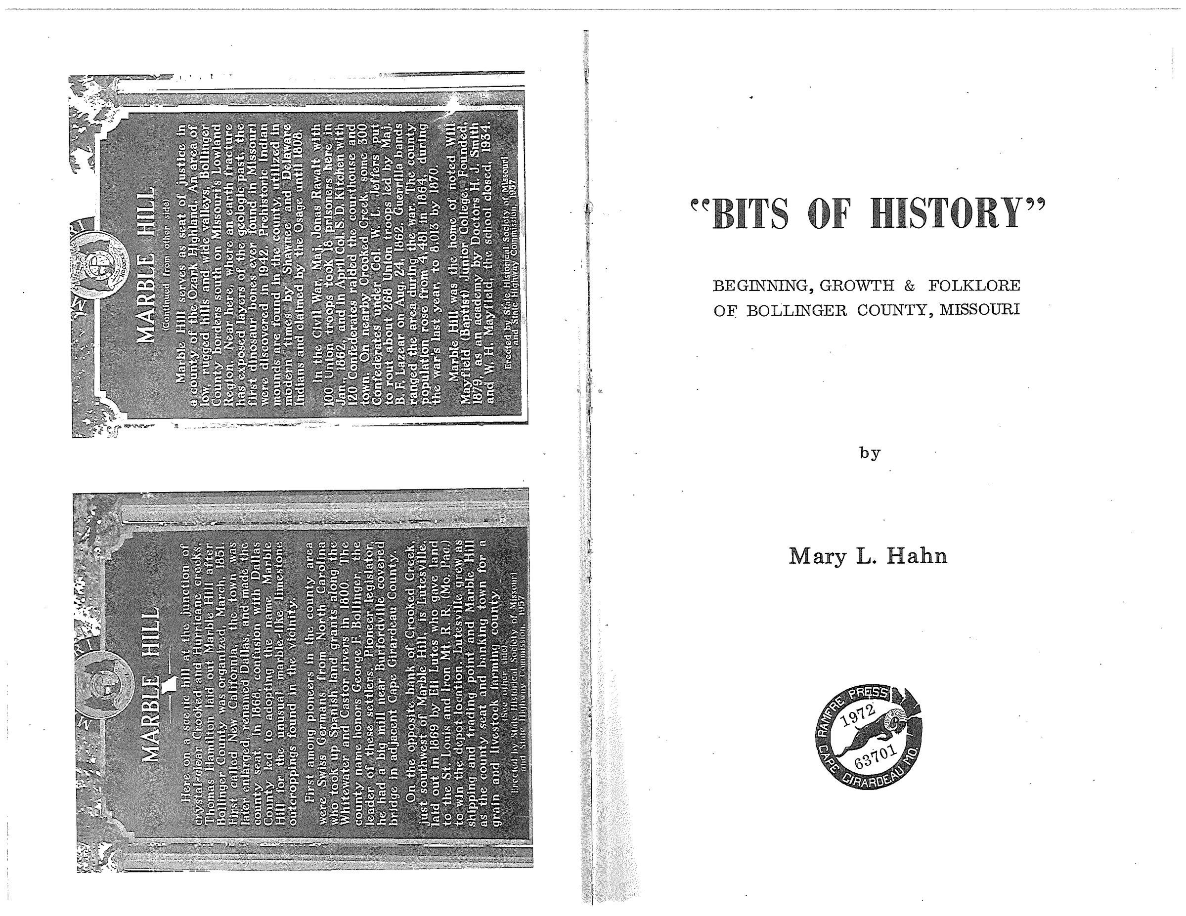 Hahn, Mary L. "Bits of History": Beginning, Growth and Folklore of Bollinger County, Missouri. Cape Girardeau, Missouri: Ramfre Press, 1972, pg. 1-2, 14-16.