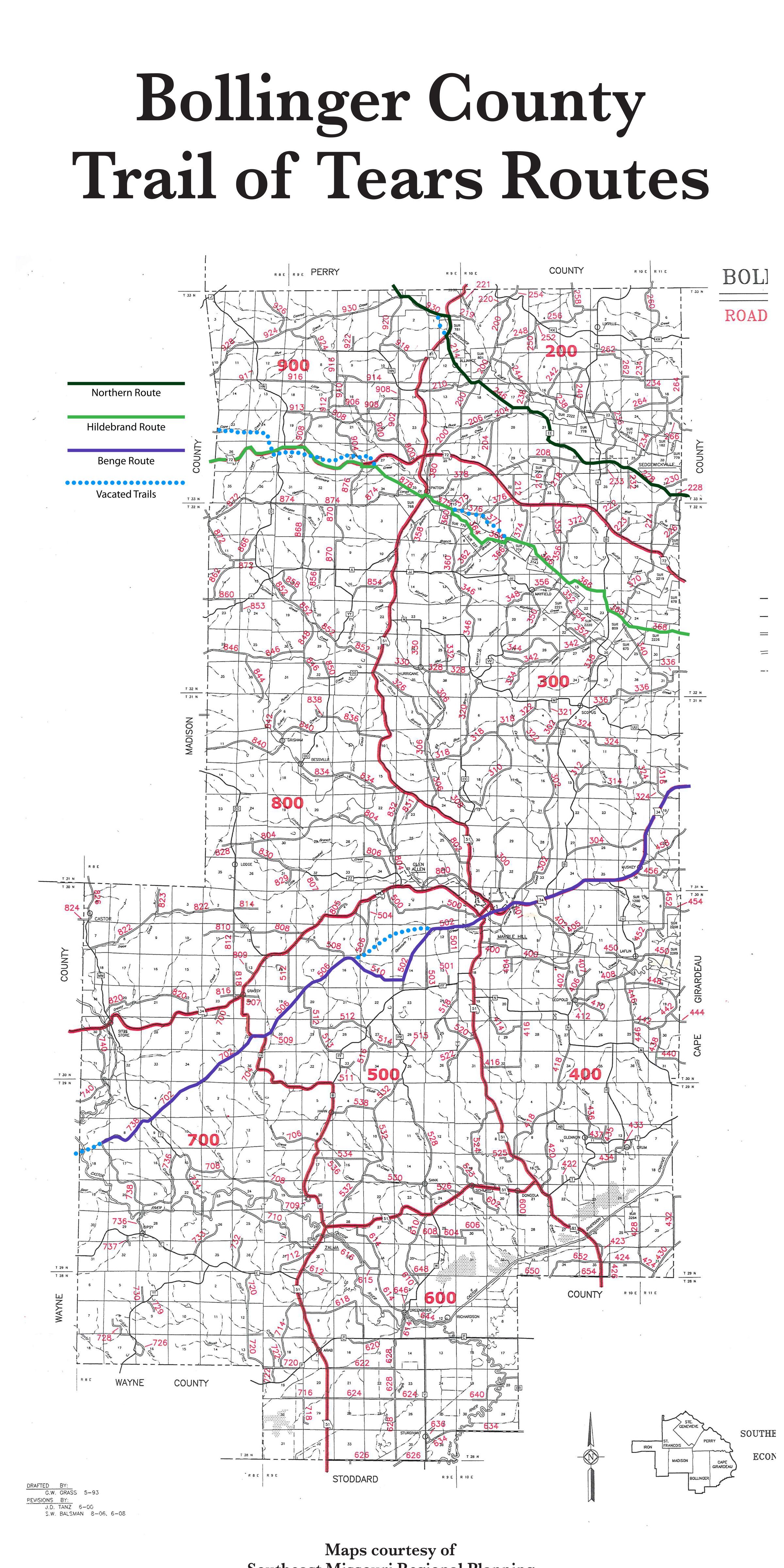 Map of the Bollinger County Trail of Tears Routes, showing the Northern (Dark Green), Hildebrand (Bright Green), and Benge (Purple) routes and vacated trails (blue dots) as they passed through the region.Acquisition