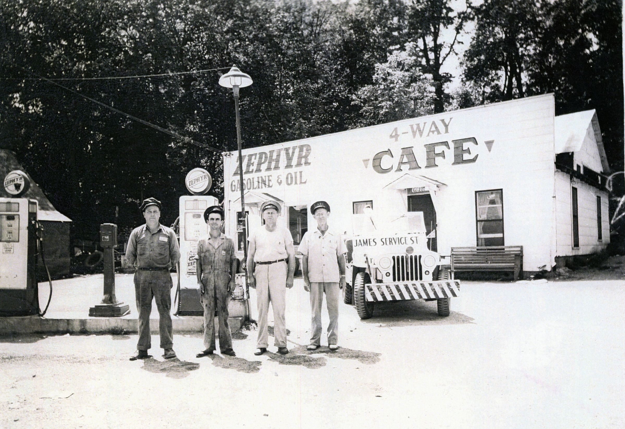 Lindel James, Frank Ward, Harry Shetley, Hovie Scott pictured in front of the Zephyr Gasoline & Oil / 4-Way Café building.Photograph Details