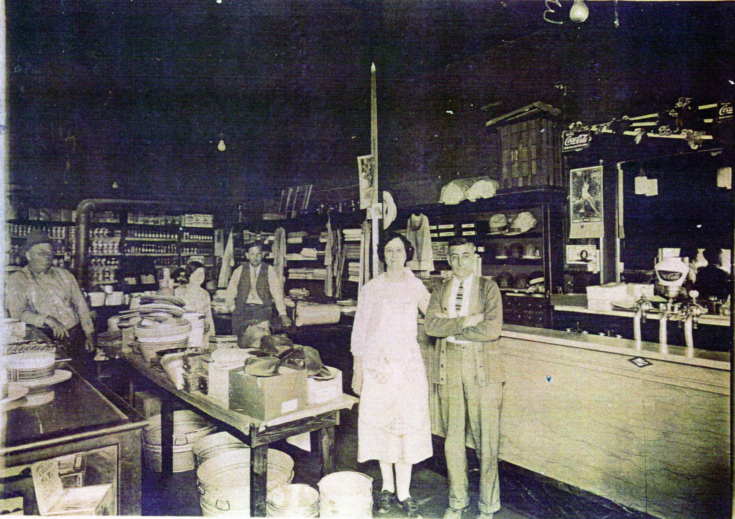 Mr. & Mrs. Robert Eaker inside their store on First Street. The building was formerly Peoples Bank.Photograph Details