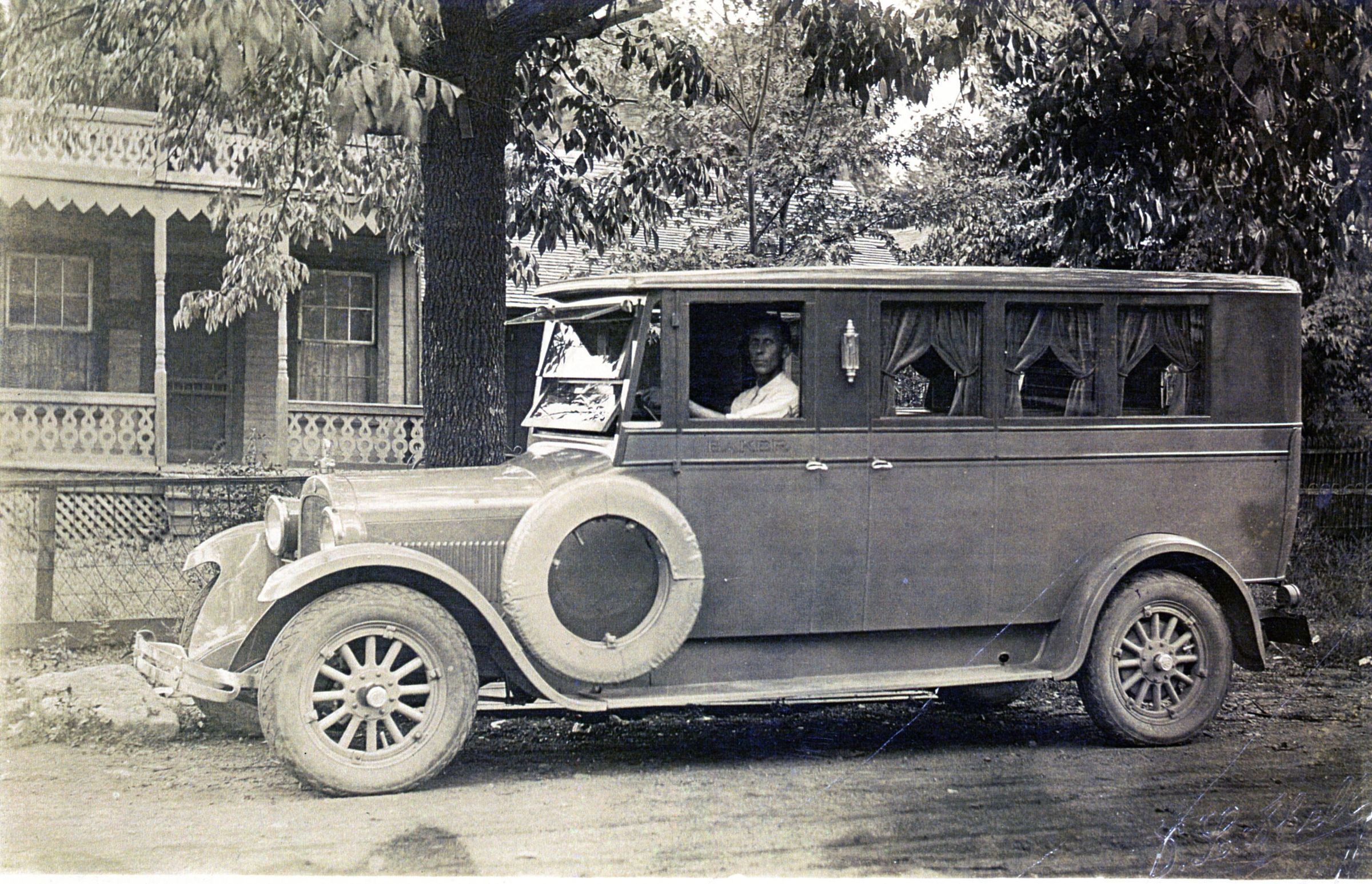 A.J. Baker in a 1926 Dodge Hearse, in front of Dr. William & Cora Lages residence on Union Street in Lutesville.Photograph Details