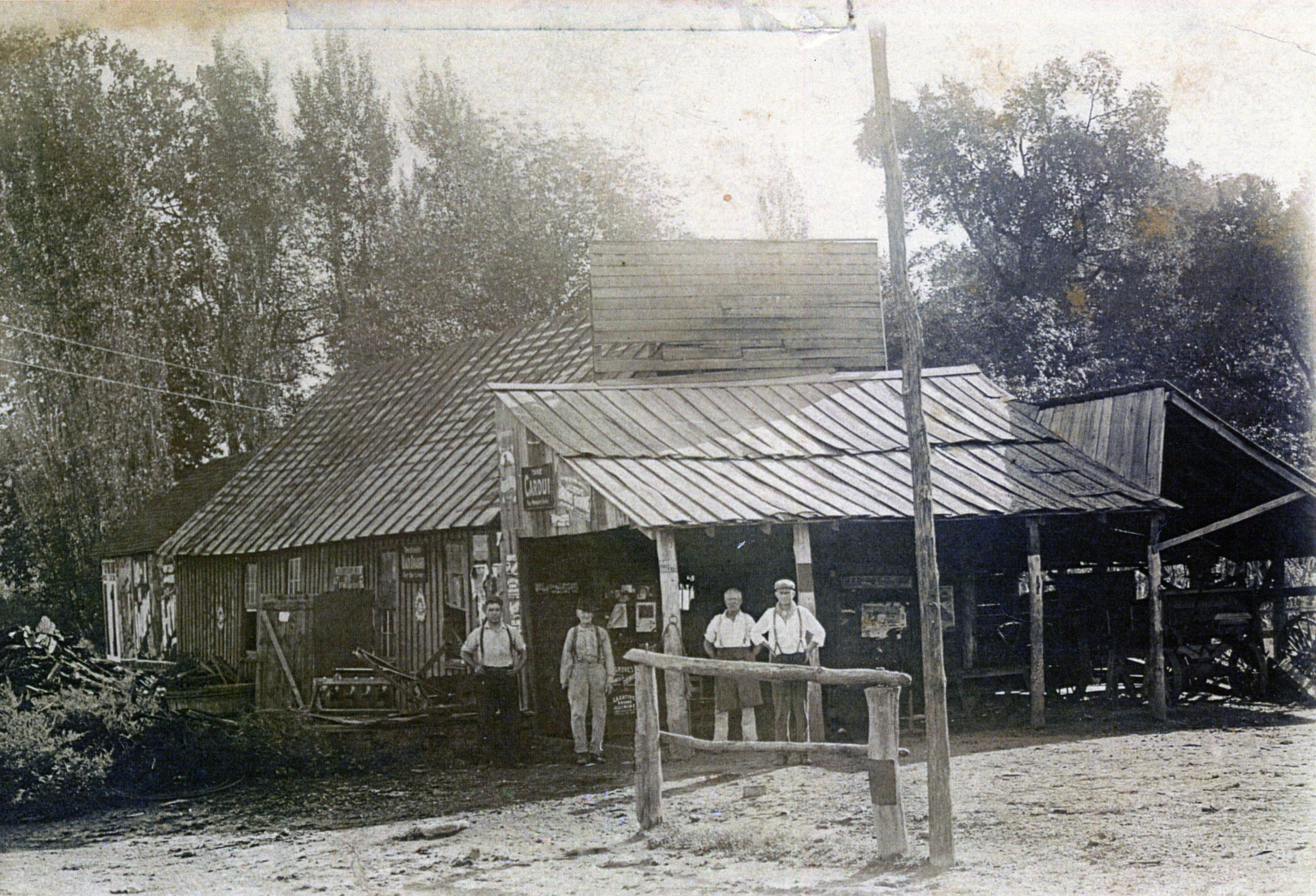 Pictured: Wyant Burford Sr., unknown, W.S. Burford, and Jim Burford. An advertising sign reads "Cardui" which was a popluar womens' drug at the time.Photograph Details