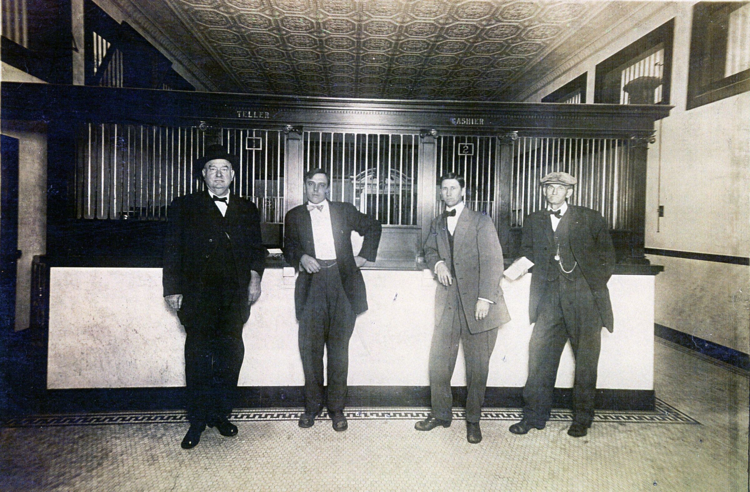 bank officers posing in front of a teller window. F.M. Wells; S.E. Chandler; C.O. Hobbs; W.E. DickeyPhotograph Details