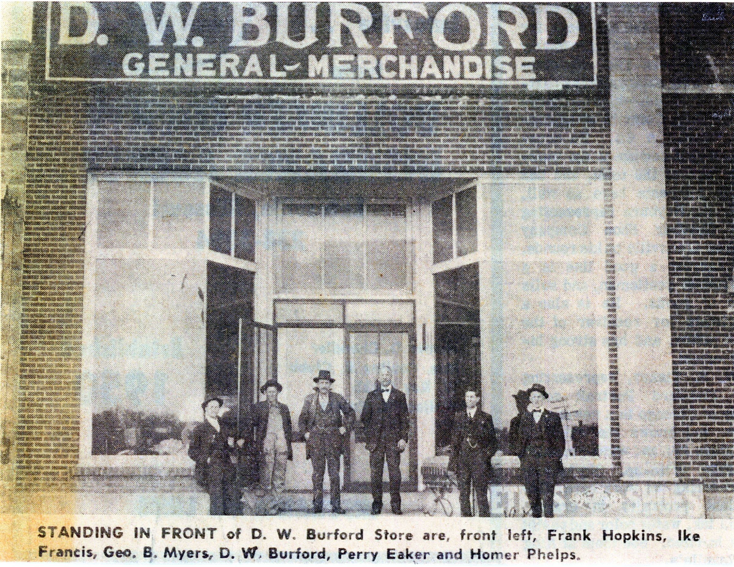 Frank Hopkins, “Drummer“ (salesman), Ike Francis, George B. Myers, D. W. Burford (owner), Perry Eaker and Homer Phelps at D. W. Burford’s Store on First Street.Photograph Details