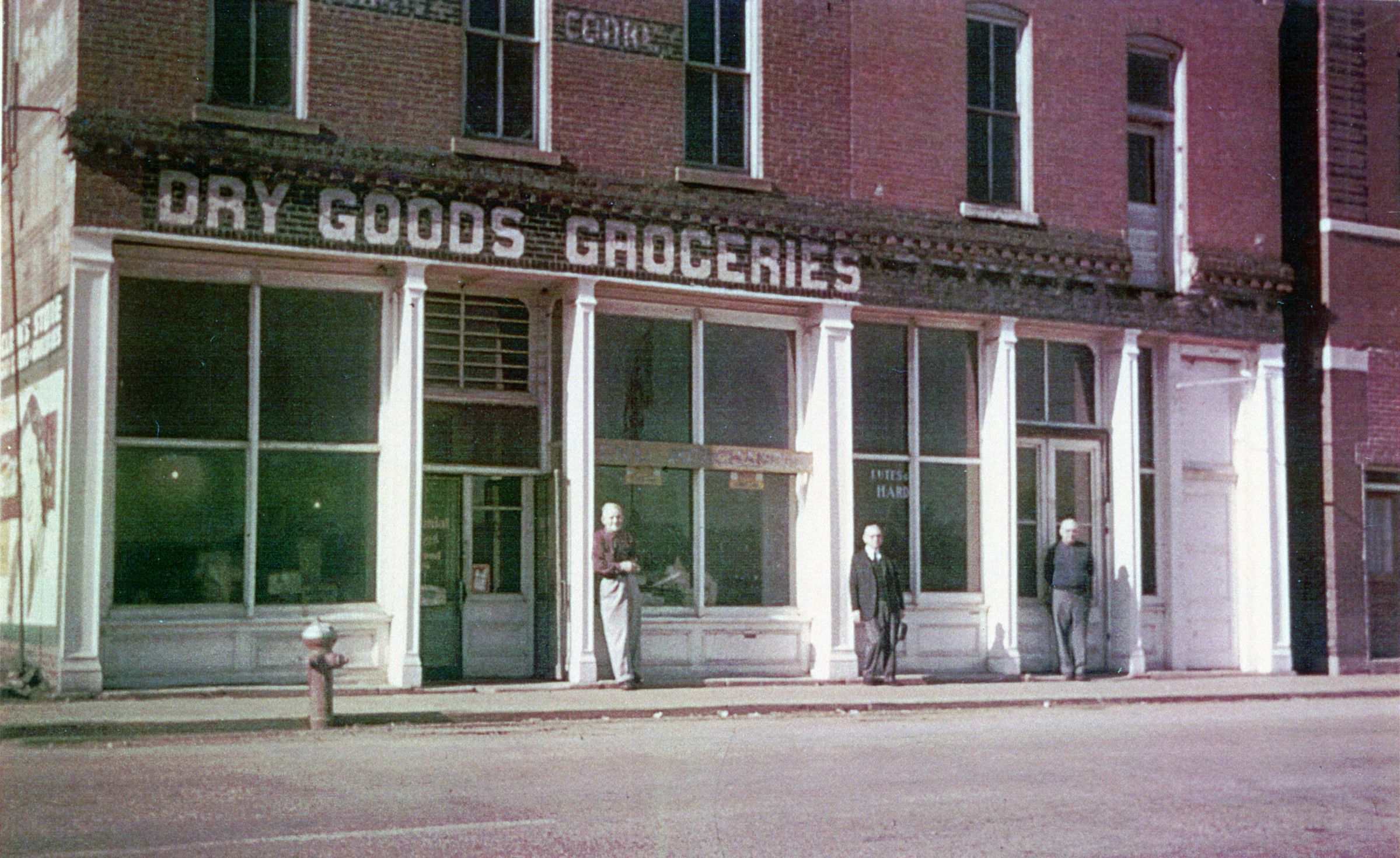 George A. Clark, Jr. Clark’s Store, Linus Hartle and Charles Lutes in front of their hardware store on First Street.Photograph Details