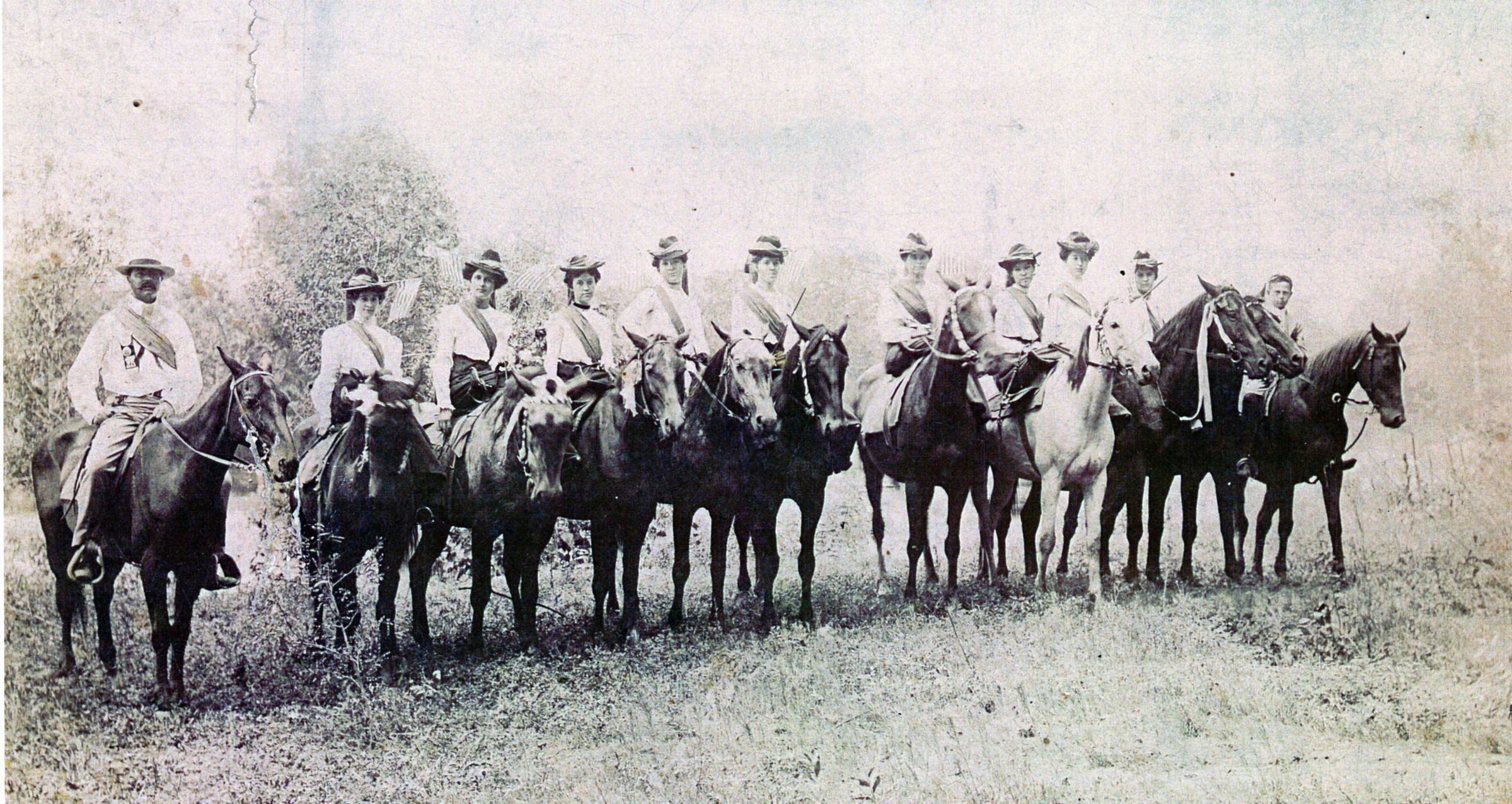 Left to Right Grand Marshal, Sheriff Dolph King, Gertrude Biggs, Mayme Revelle, Maude Dale, Hattie Dale, Della Warren, Pearl Lutes, Jessie Phelps, Alpha Myrick, Alma (Burke) Hobbs, and Roy DrumPhotograph Details