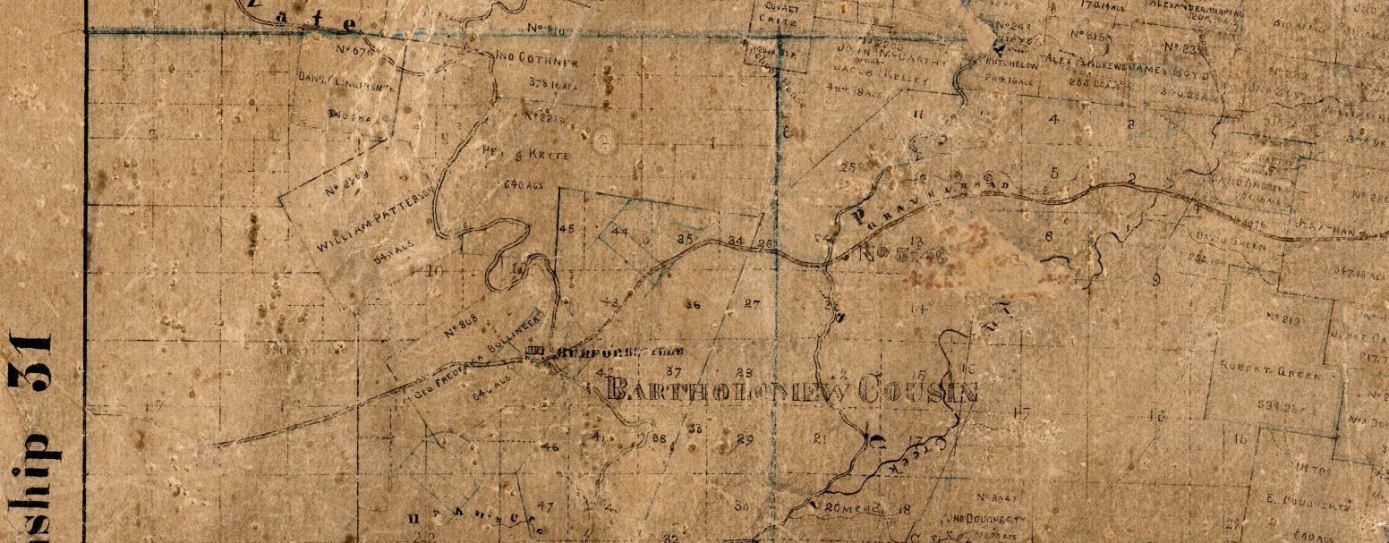 Scanned section of the 1870 James Brooks Cape County map showing Hwy 34 which was a "gravel road" established as a postal/family road in the 1790's.Collection