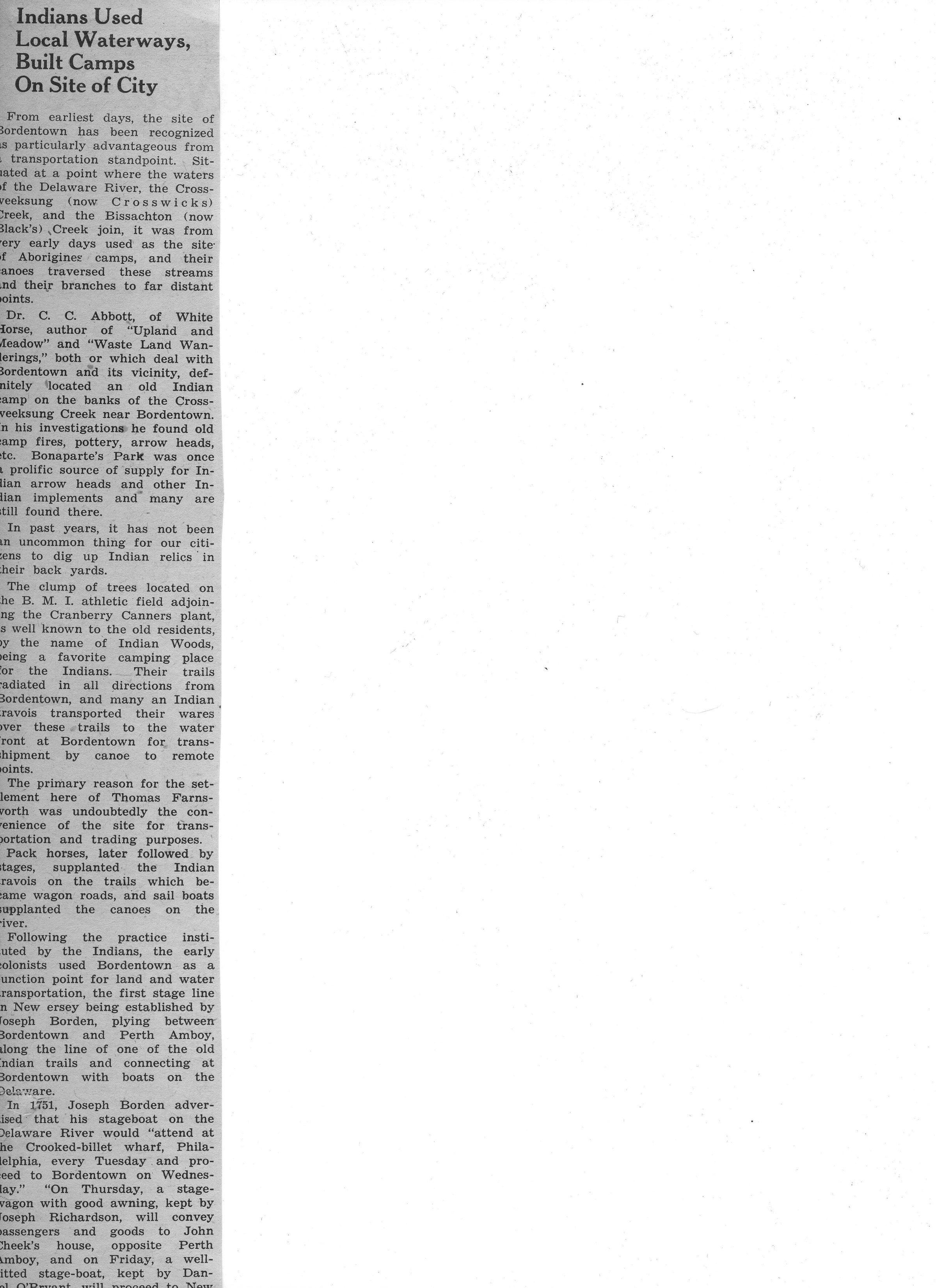 Newspaper Article likely from the Bordentown Register about the Indian Waterways and Dr. C C. Abbott, date unknownCreate Date
