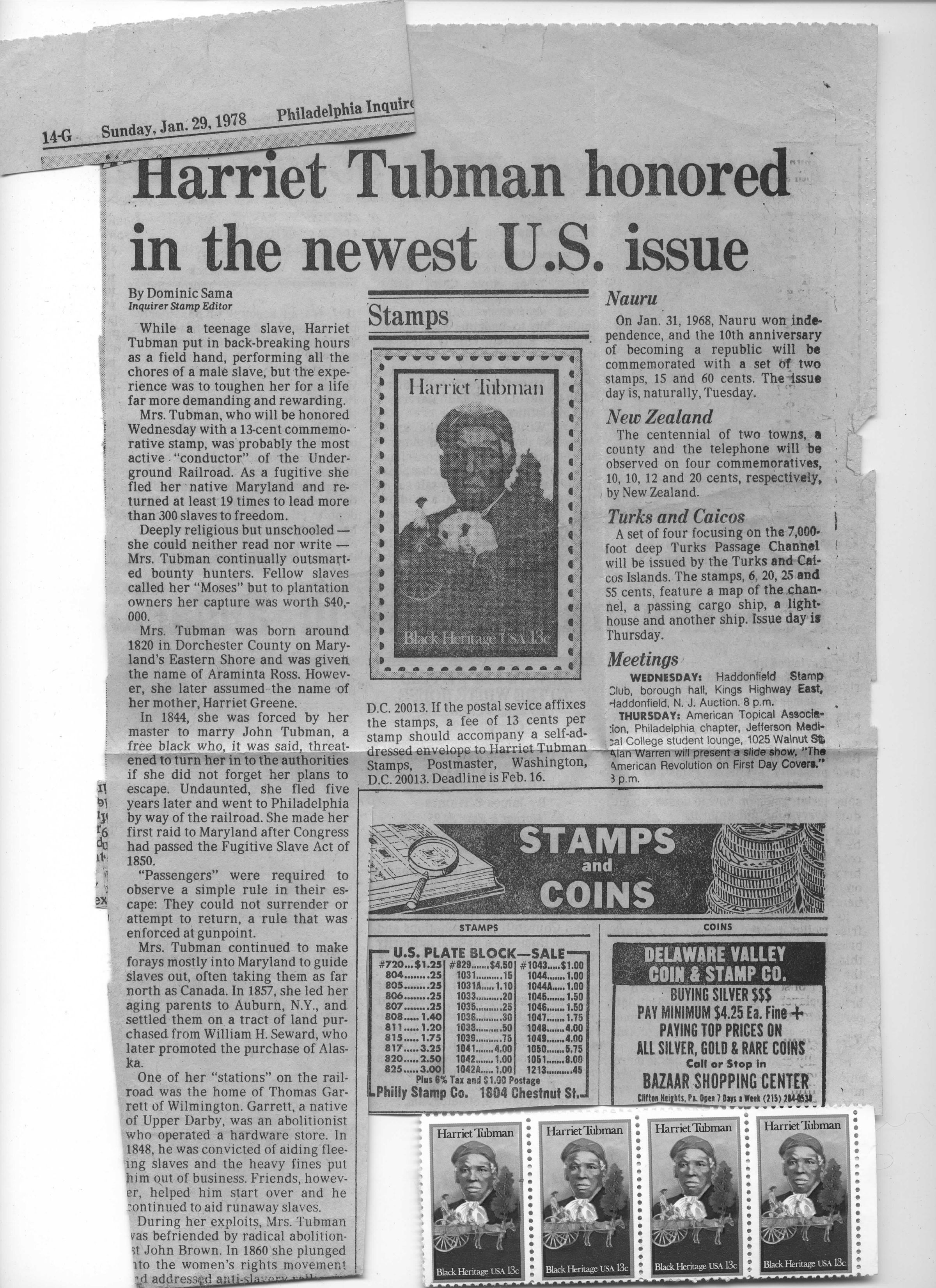 A newspaper clipping from the "Philadelphia Inquirer". Headline: Harriet Tubman (Jan 29, 1978)Collection