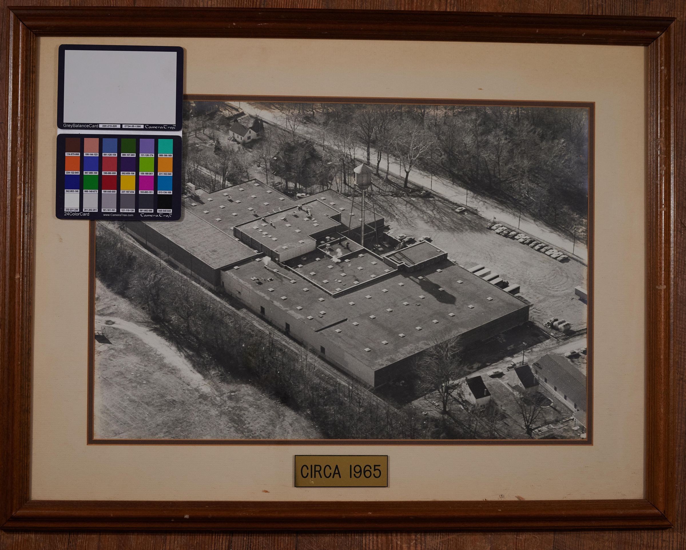Aerial black and white photograph of Ocean Spray Company with frame; gold plaque in bottom center of mat reads "CIRCA 1965"Photograph Details