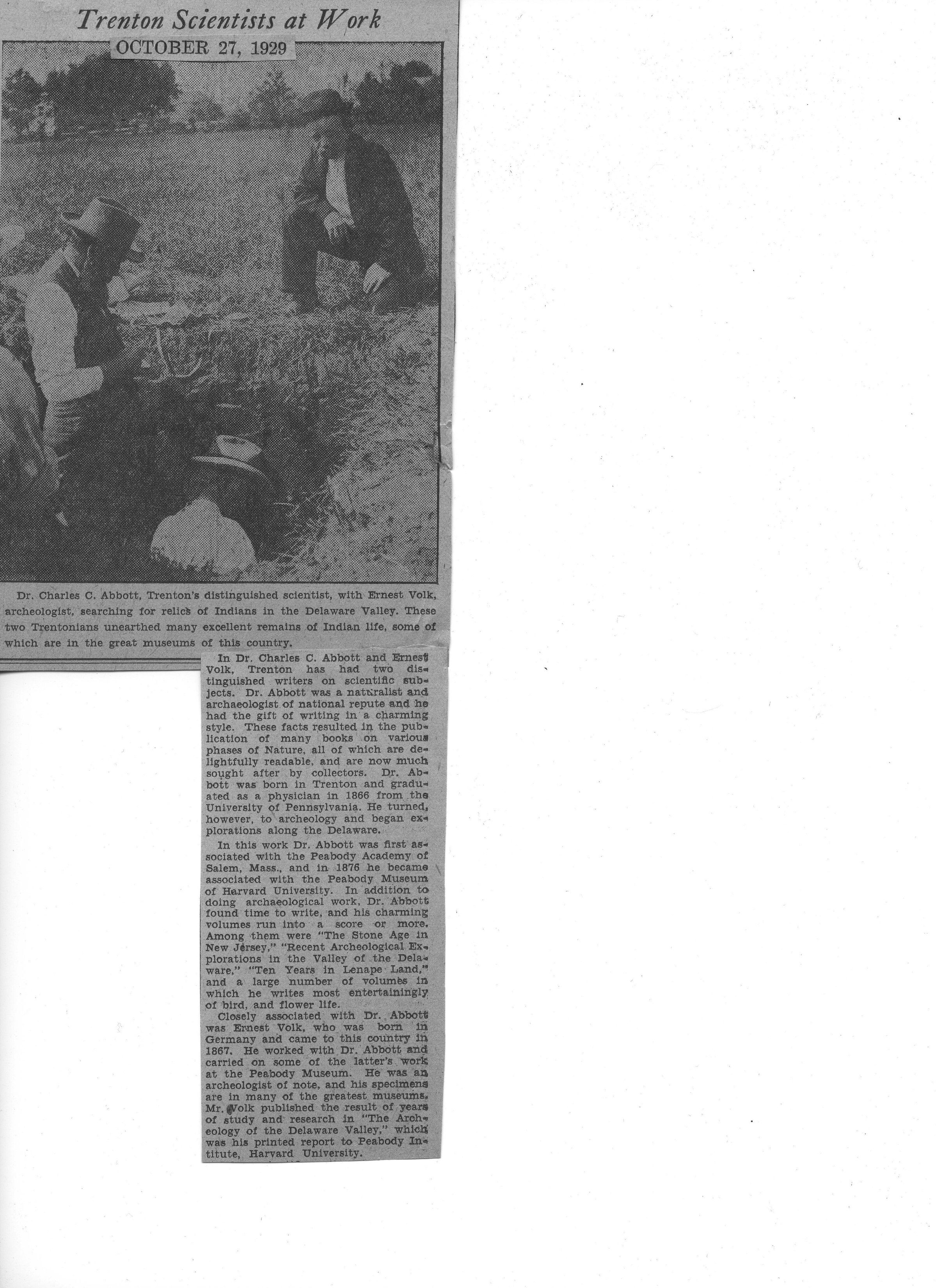 Newspaper Article from October 27,1929 about Dr. Charles C. Abbott, Trenton's distinguished scientist, with Ernest Volk, archeologist searching for relics of Indians in the Delaware ValleyCreate Date