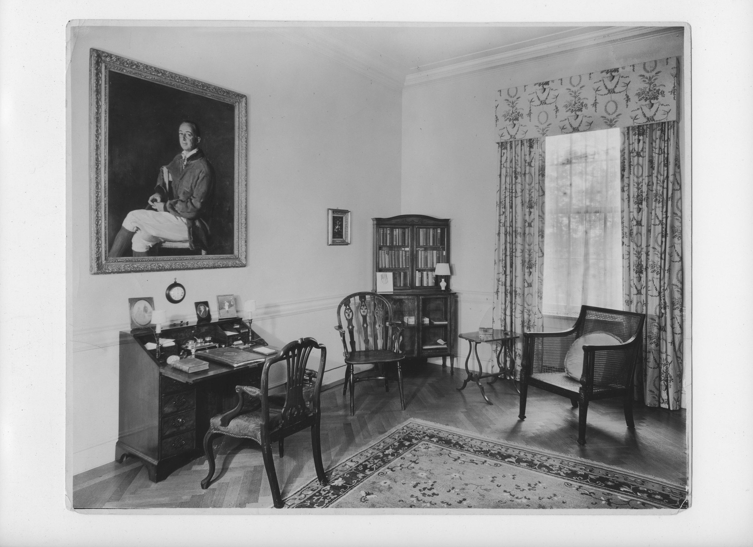 Office room with desk, Large portrait of Harris Hammond, Secretary desk, small bookshelf, three chairs, window with curtains, parquet flooring and an oriental rug.Create Date