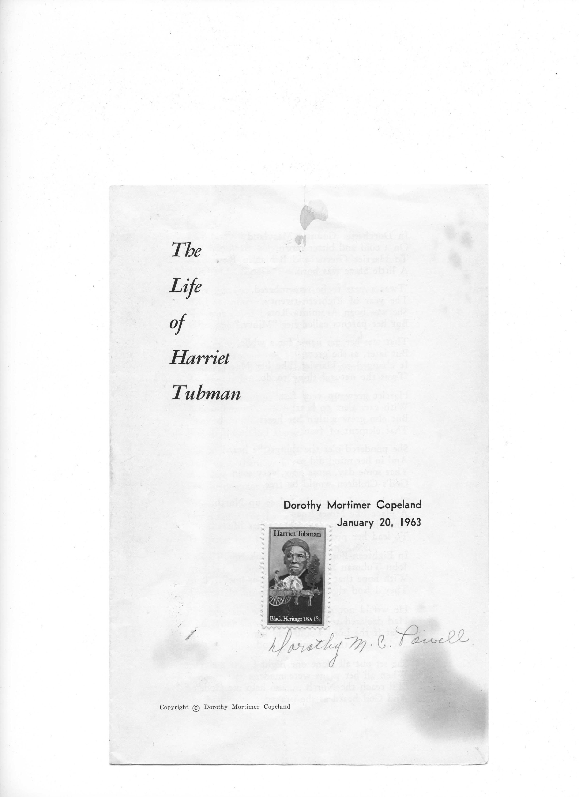 This is a poem on the life of Harriet Tubman by Dorothy Mortimer Copeland made on January 20, 1963.Create Date