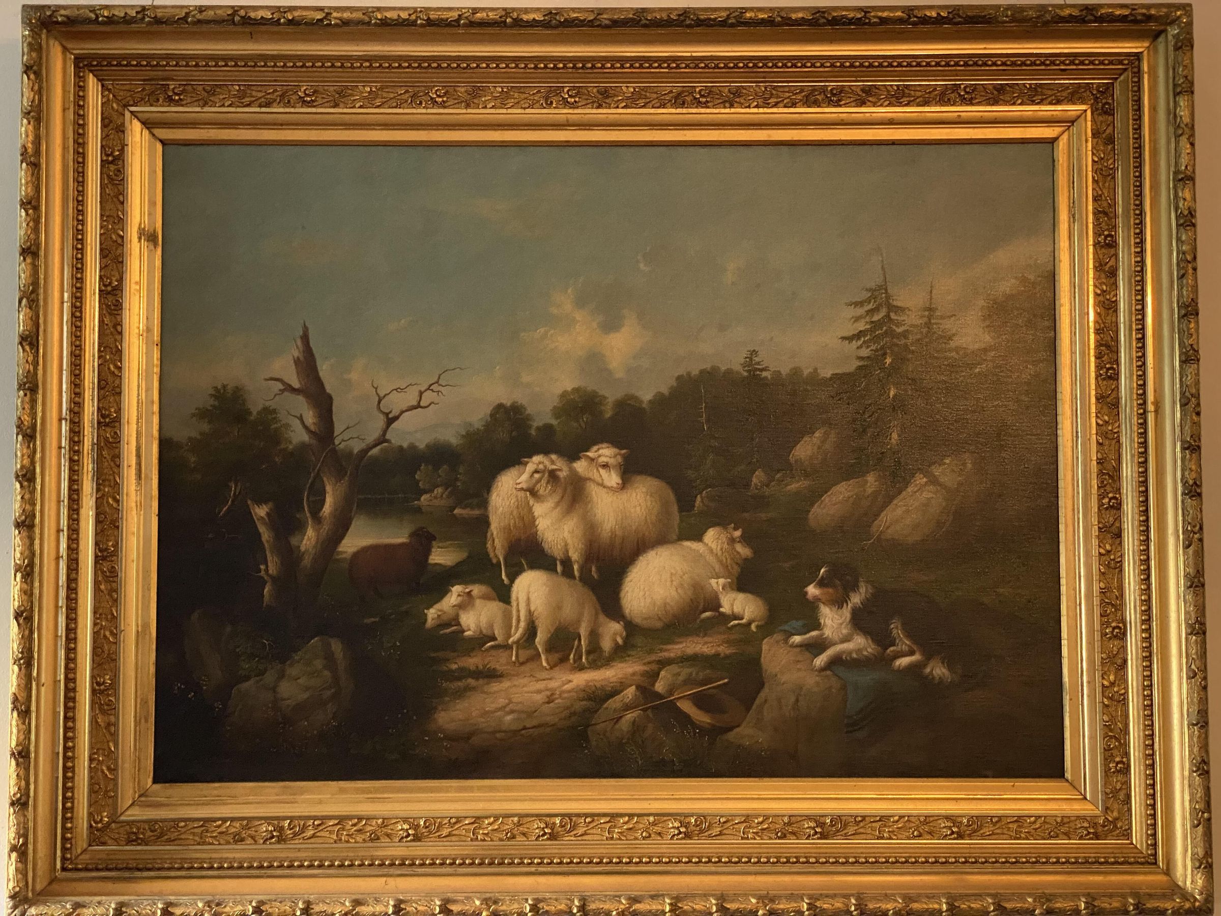 Susan C. Waters Painting - Sheep and Lambs with Dog in Rocky Forest LandscapeEntry/Object ID