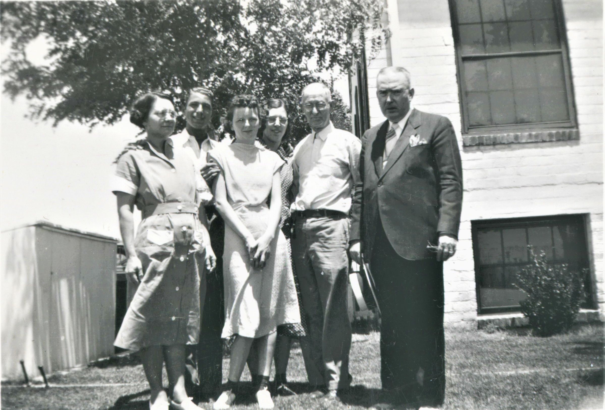 l-r: Judy Moore [housekeeper]; ?.?: Rosalie Eastman; Alex Dixon [houseman]; Leslie C. "Tommy" Thompson; night clerk; Judy Moore photoCollection
