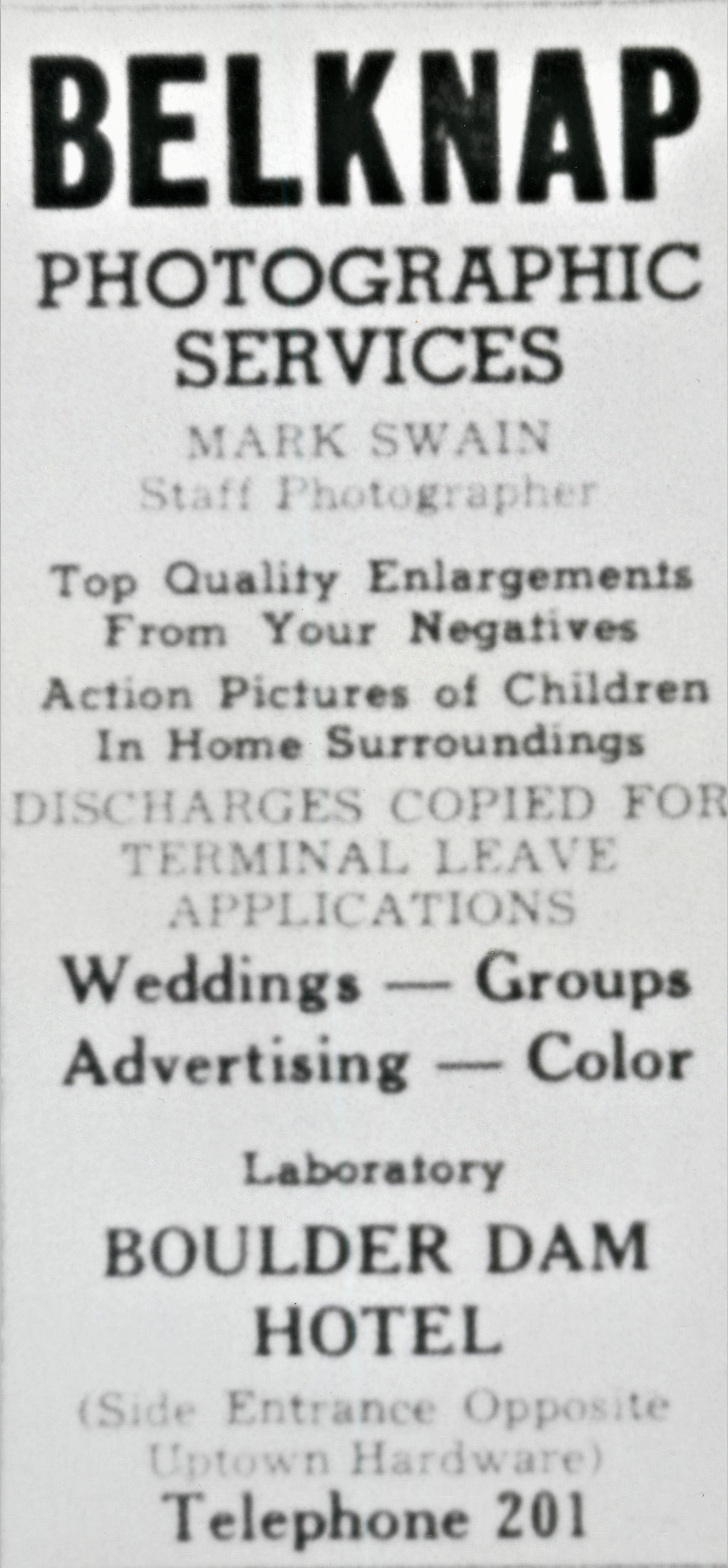 Belknap Photographic Services with Mark Swain advertisement Boulder Dam Hotel basement; Boulder City News; July 7, 1947 p. 7Collection