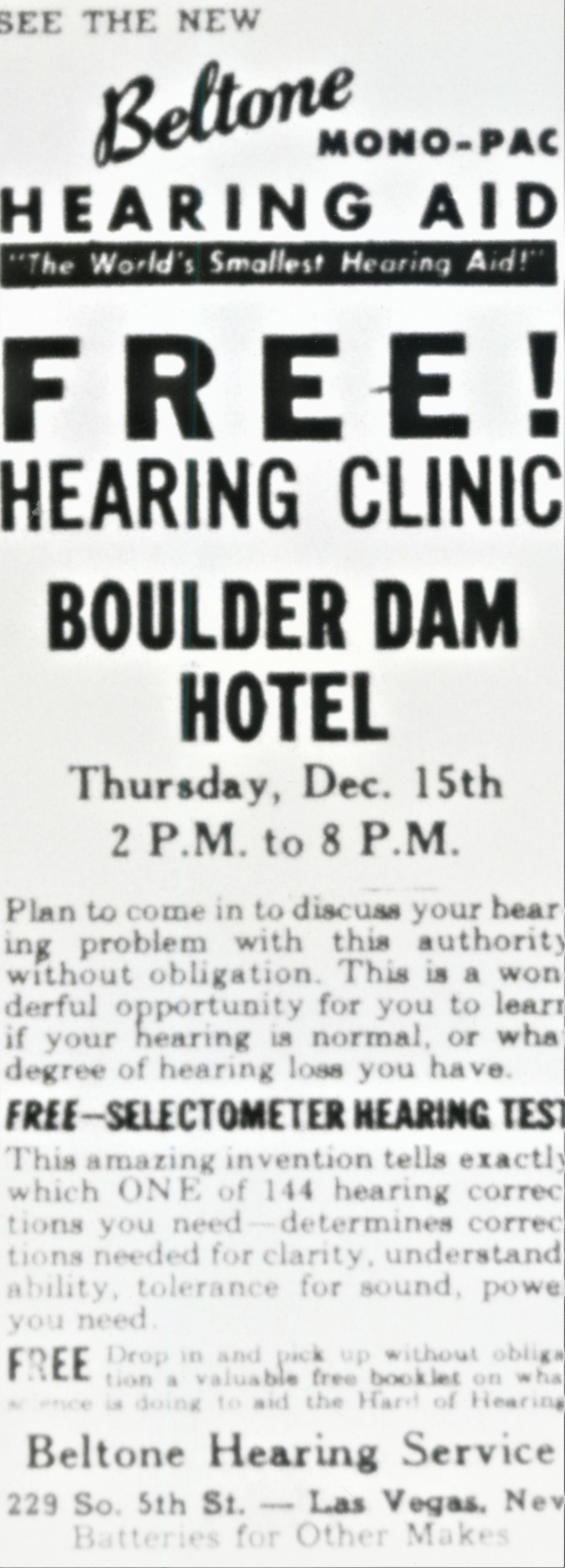 Boulder Dam Hotel advertisement for a Beltane Hearing Aid hearing clinic at the Boulder Dam Hotel; on December 15, 1949; Boulder City News; December 2, 1949 p. 3Collection