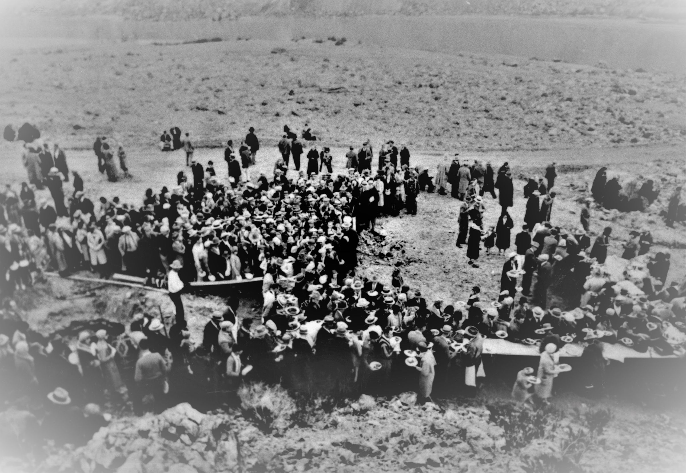 Roads and streets; Kingman Highway; dedication ceremonies on the Arizona side of the Colorado River; December 3, 1931; note the Hoover Dam Terminal; on the Nevada; side of the river; for the ferry; event celebrated with barbecue; Boulder City Library; Graphic Views of Hoover Dam; Winthrop A. Davis, photographerCollection