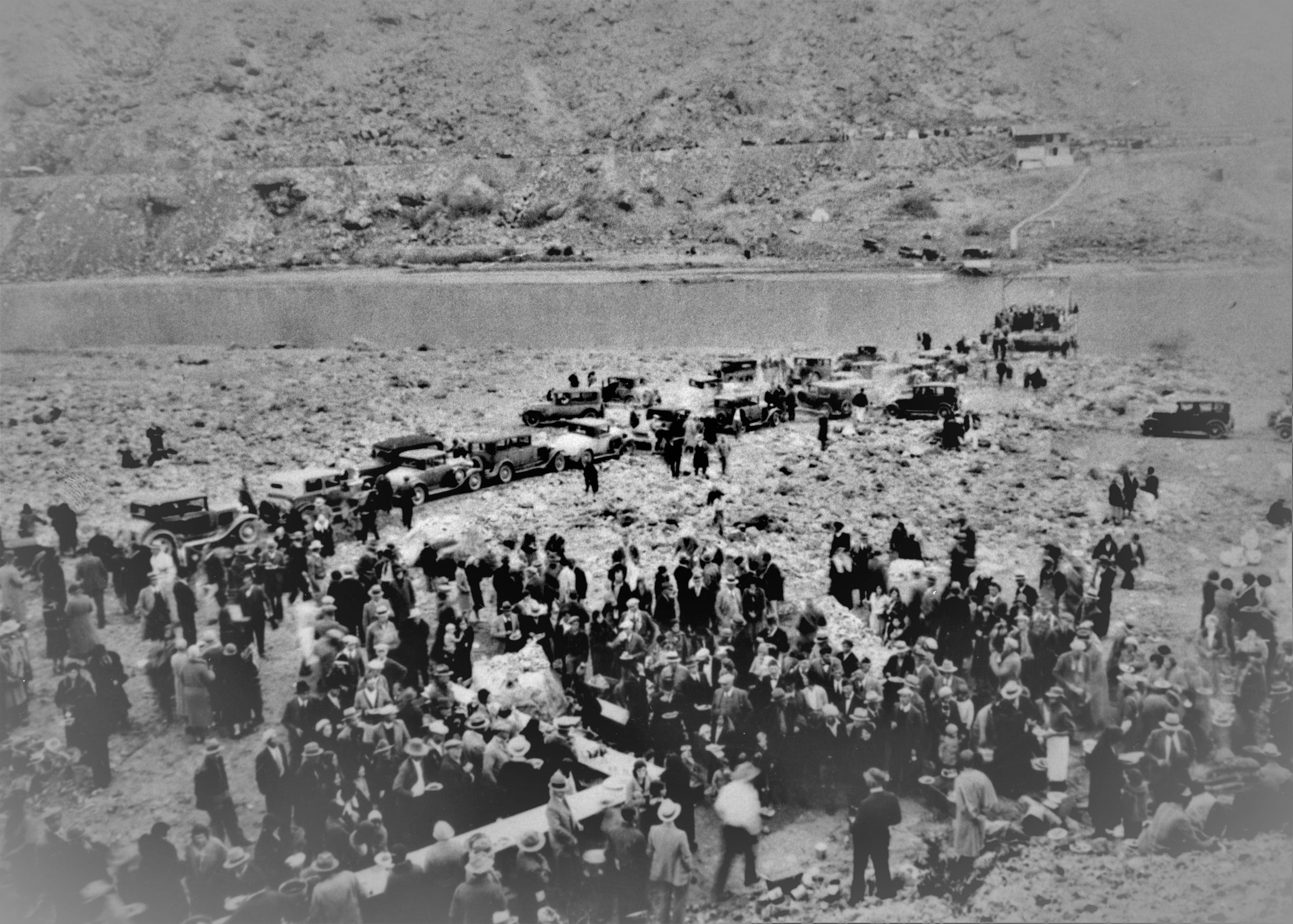 Roads and streets; Kingman Highway; dedication ceremonies; on the Arizona; side of the Colorado River; December 3, 1931; note the Hoover Dam; Terminal; on the Nevada; side of the river for the ferry; event celebrated with barbecue; Boulder City Library; "Graphic Views of Hoover Dam,"; Winthrop A. Davis, photographerCollection