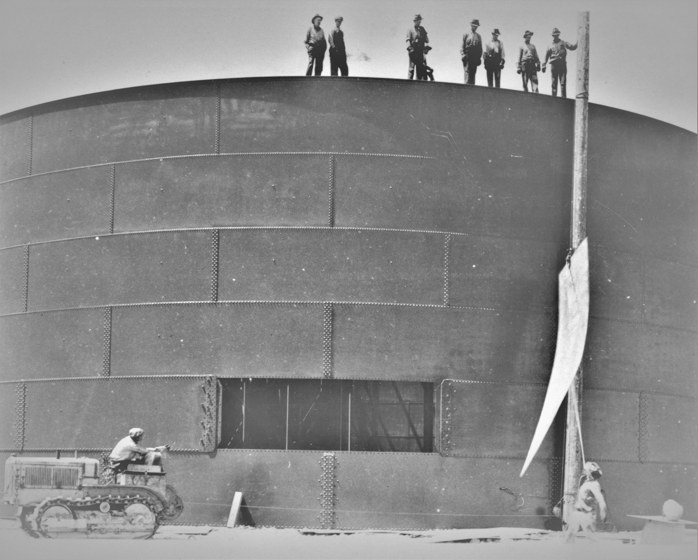 Boulder City; water system; The last sheet of iron being hoisted into place; on Boulder City’s water storage tank; Mid - 1931; Boulder City Library; Graphic Views of Hoover Dam; photo no. 97; Winthrop A. Davis, photographer; Roll 12 - Photo. No. 5; Copy Negative; Bureau of ReclamationCollection
