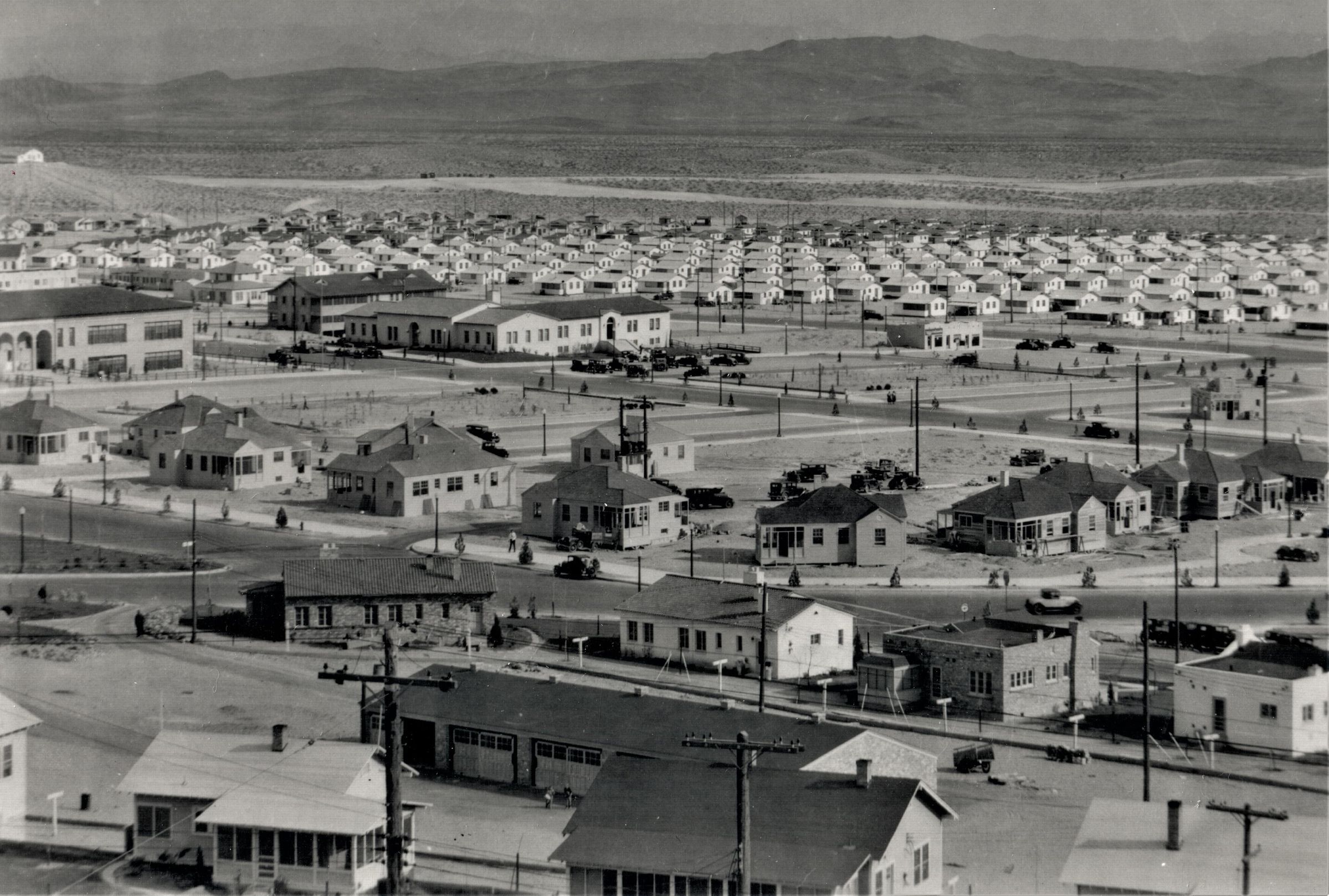 Boulder City; panorama view; southeast from Water Tank hill; Babcock and Wilcox Company; cottages under construction; center; 3 March 1933; UNLS-catalog monograph LA 327 86 63Lexicon