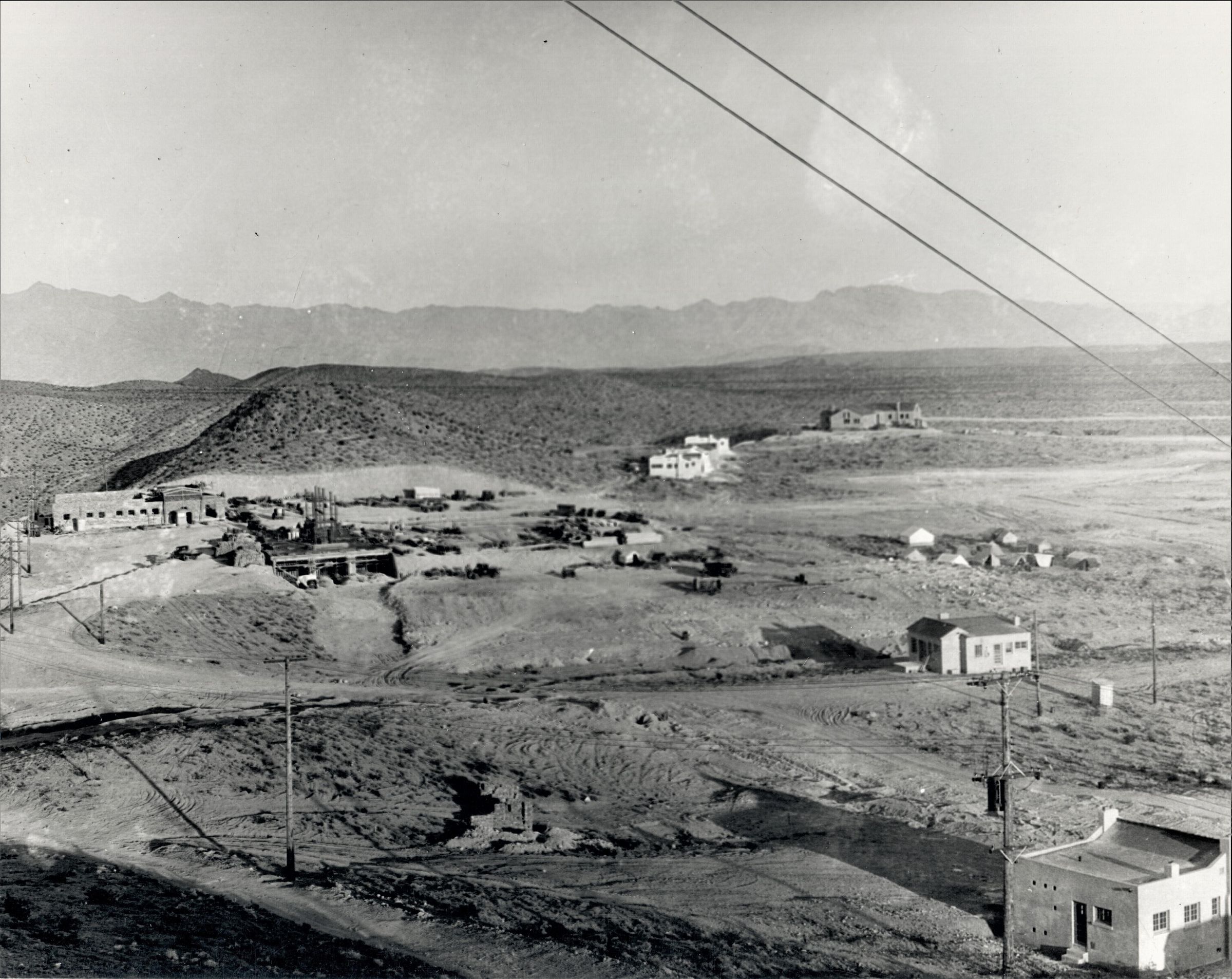 Boulder City; panorama view; east from Water Tank hill; left: U. S. Bureau of Reclamation Dormitory no. 1; and administration building under construction; right side in the distance; Six Co. Hospital; c. September - October 1931Made/Created