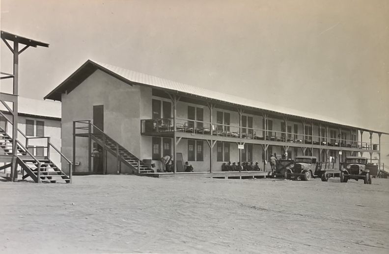 Boulder City; Six Co's. dormitory; c. 1931-32; note beds pulled out to the balcony to escape the heat; the sign reads, “Positively No Loafing”; desert water bags hang from the postsLexicon