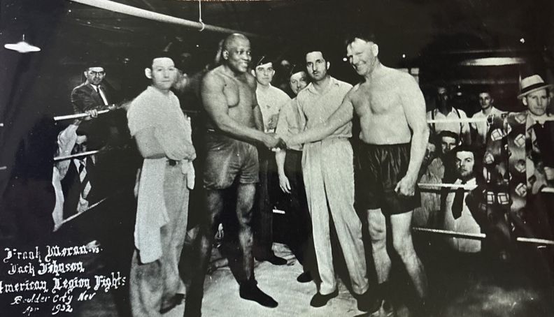 Boulder City: Anderson Brothers mess hall; boxing match between Frank Moran and Jack Johnson; sponsored by the American Legion Post 31 on April 15, 1932; right background: hat-less young man with the long nose is Thomas R. “Bob” ParkerLexicon