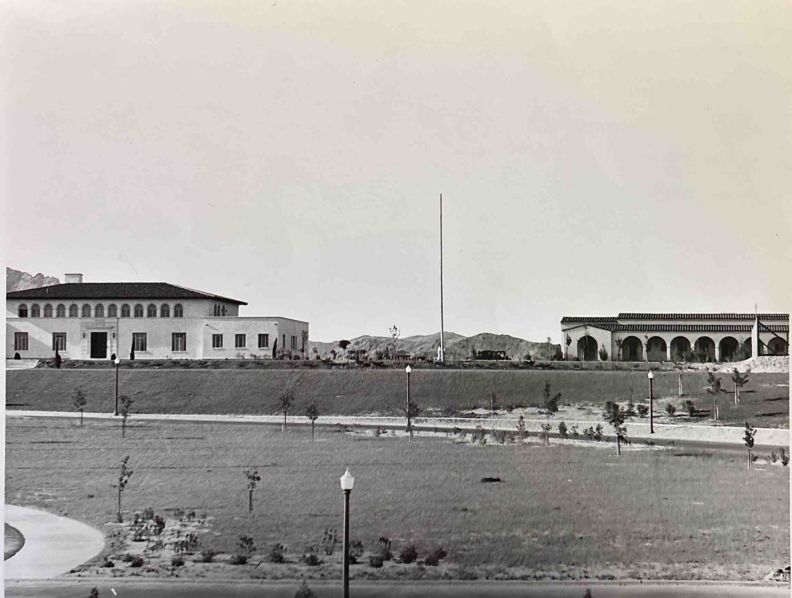 Boulder City; U. S. Bureau of Reclamation; administration building, left Dormitory no. 1, right; c. 1932-33; view north across Wilbur Square; note new landscapingLexicon