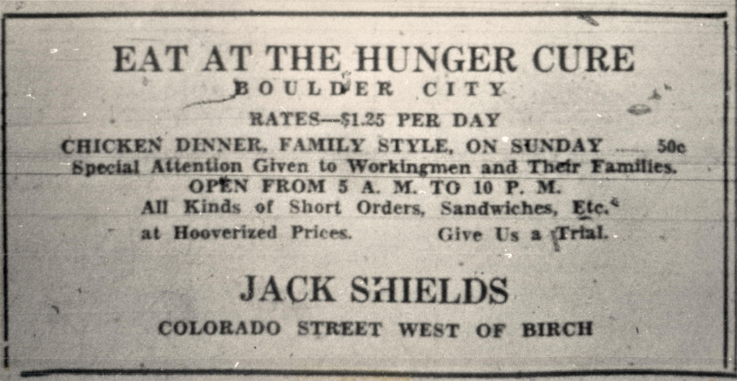 Hunger Cure: advertisement from the Las Vegas Age, March 2, 1932; was Jack Shields related to Mr. and Mrs. W.F Shields in 0002:0732? Did their café/grocery store become the Hunger Cure?Location