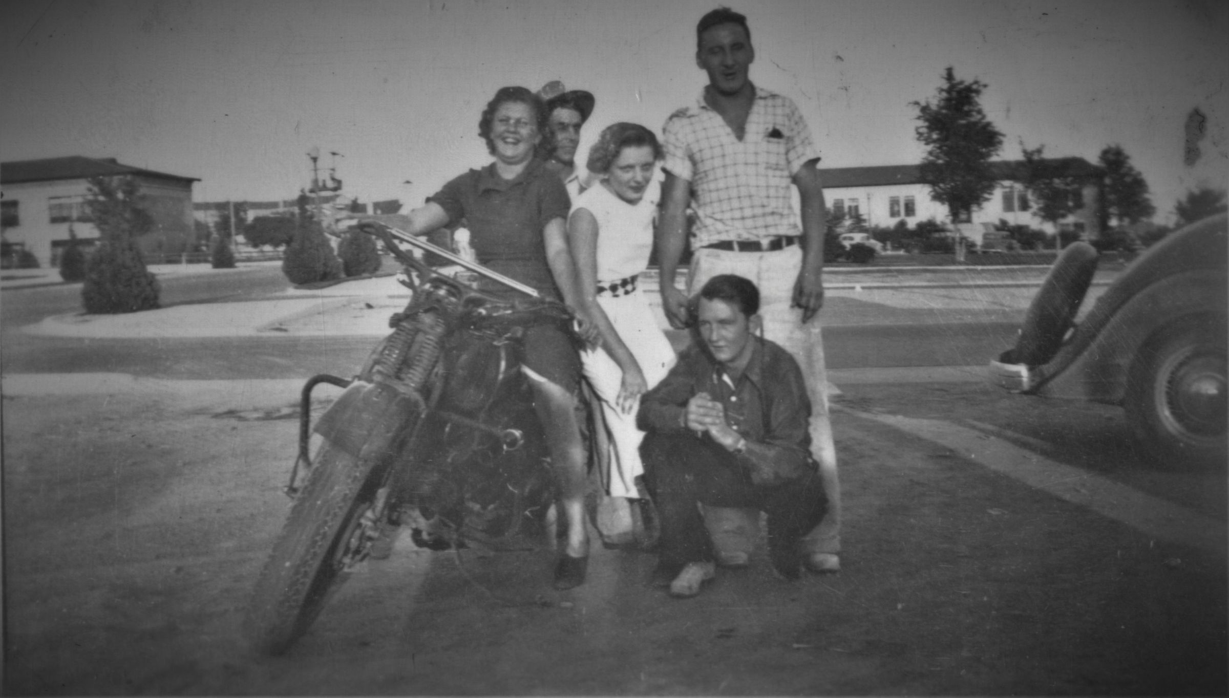 Boulder City restaurants, cafes, coffeehouses: Smith's Root Beer, c. 1936, l-r: Dorothy Bodkin on motorcycle; all others are unidentifiedCollection