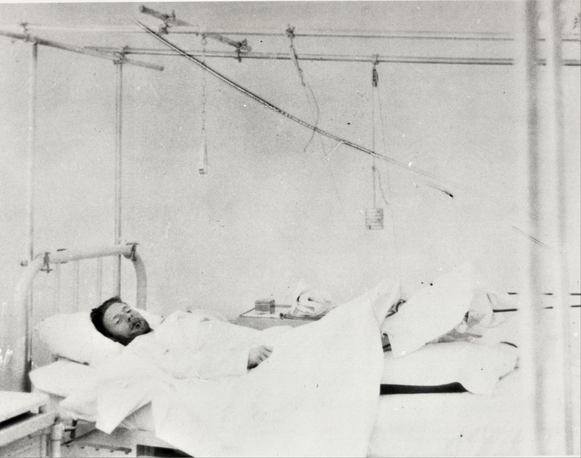 Boulder City hospital: Six Companies hospital patient, c. 1932-1933; Patient in orthopedic ward; USBR-Wash no. 952Location