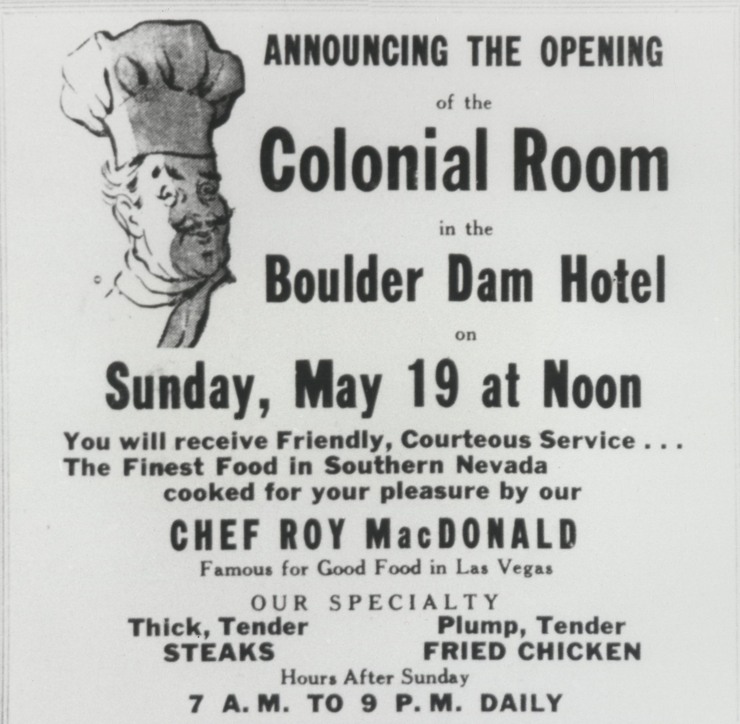 Boulder Dam Hotel dining room opening advertisement as the Colonial Room; Boulder City News; May 18, 1946; p.4Collection