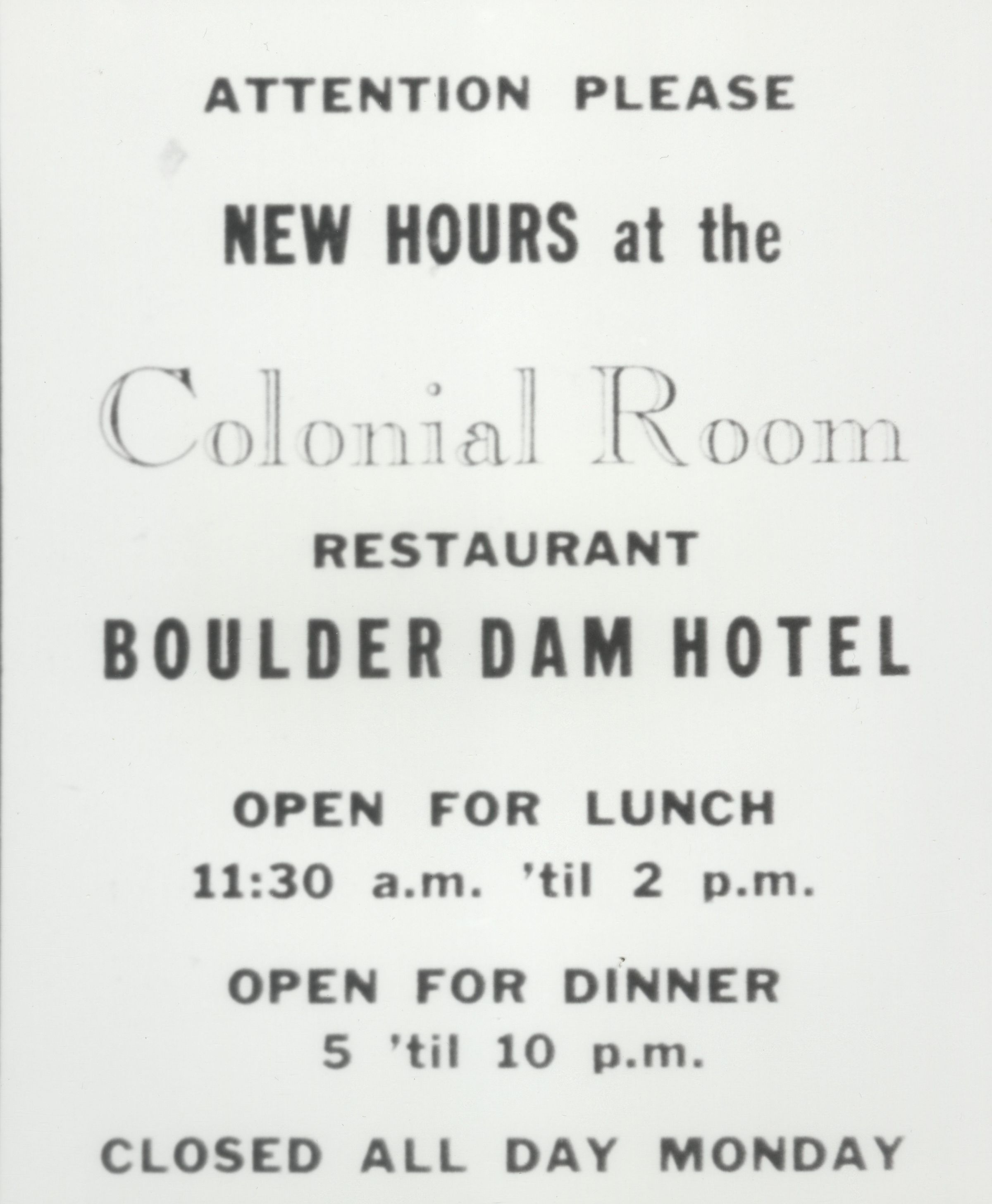 Boulder Dam Hotel dining room new hours ad; Boulder City News; June 14, 1946; p.8Collection