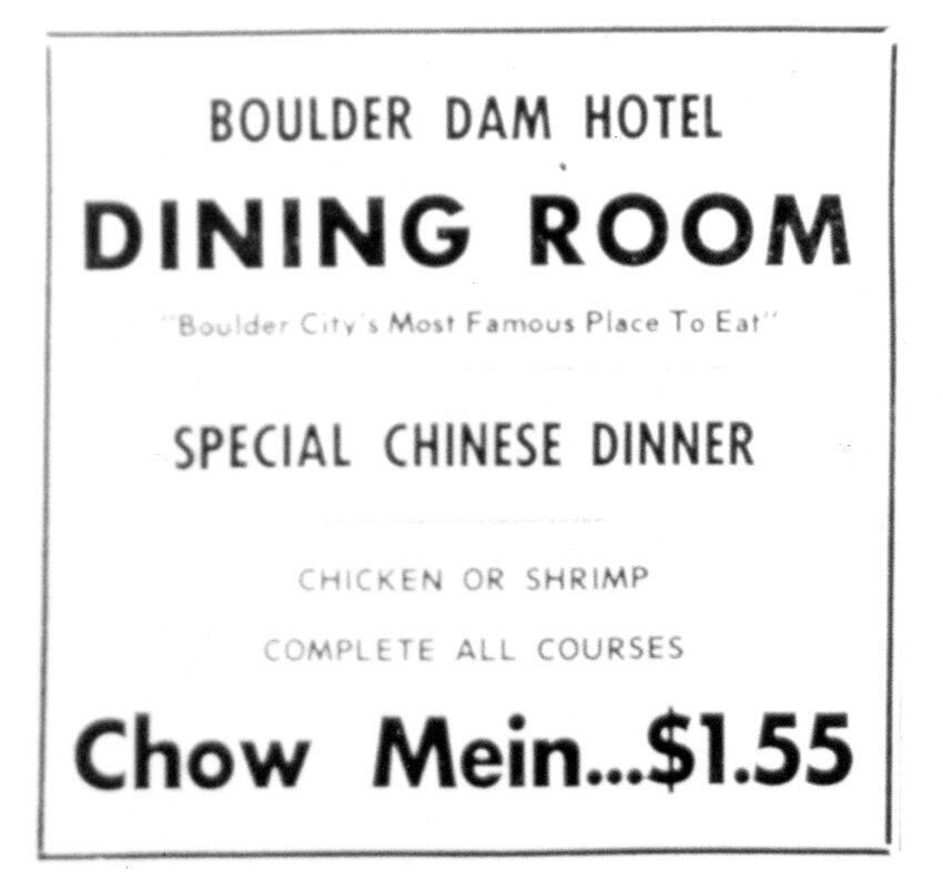Boulder Dam Hotel dining room ad; Boulder City News; March 13, 1958Collection