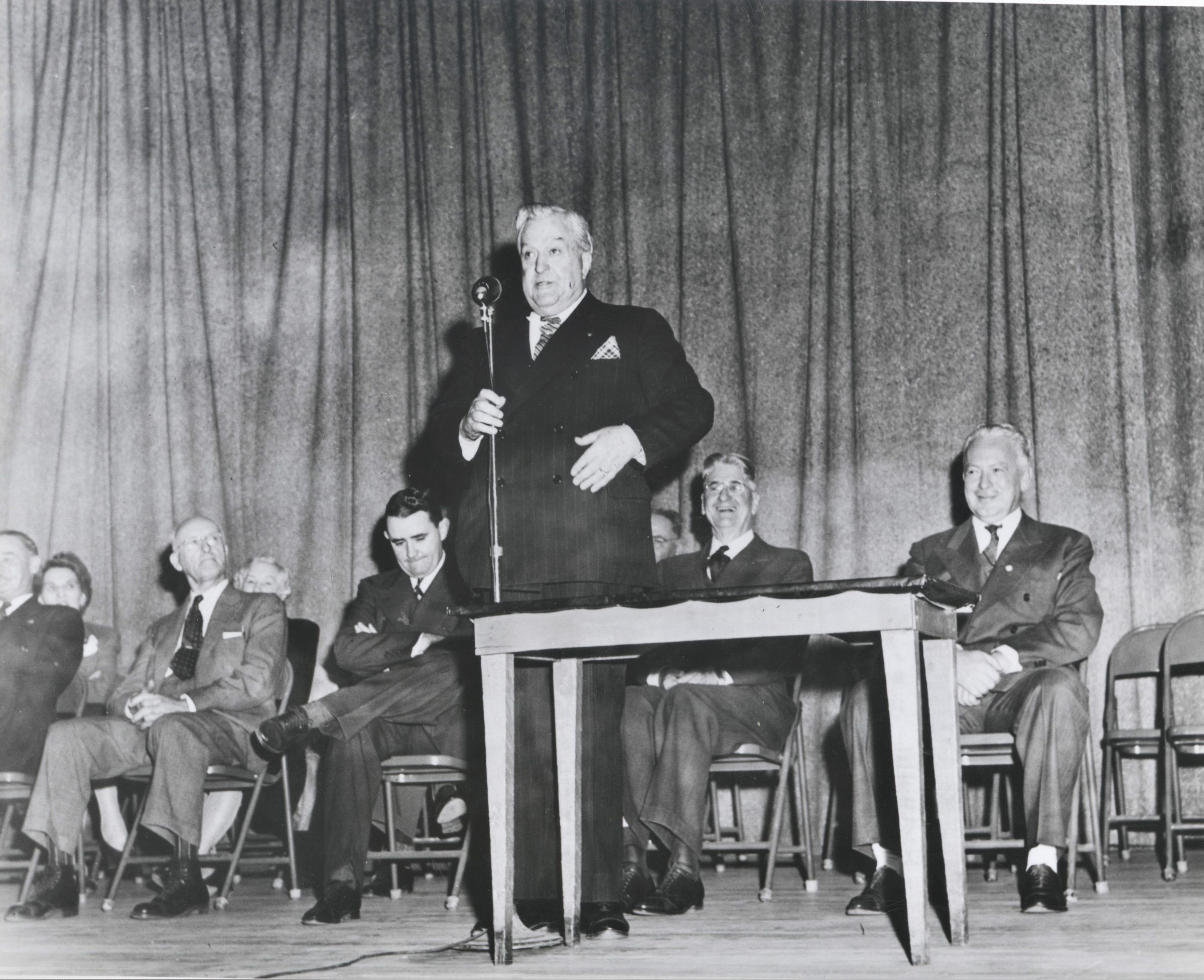 Jack Higgins; Pearl Brown; James Downs; Mrs. Hickey; Berkeley Bunker; NV. Senator Patrick McCarran, speaking; Ed W. Clark; Hap Hazard; UNLS photo: Ed W. Clark CollectionCollection
