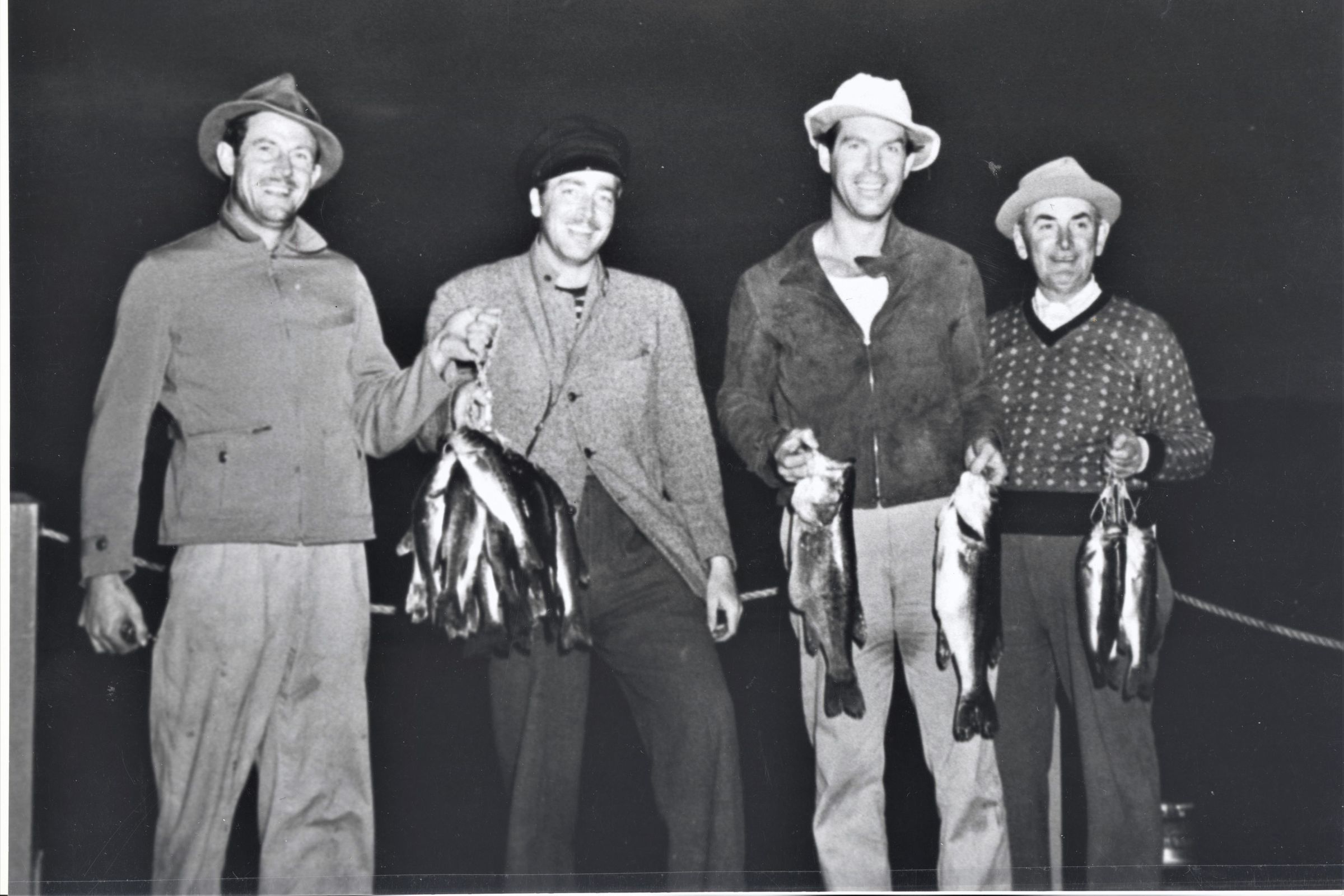 l-r: Collin Topely; John Howard; Fred Mac Murray; Mr. Cole; in charge of fishing activities at Lake Mead for Grand Canyon Boulder Dam Tours, Inc.; March 27, 1940Collection