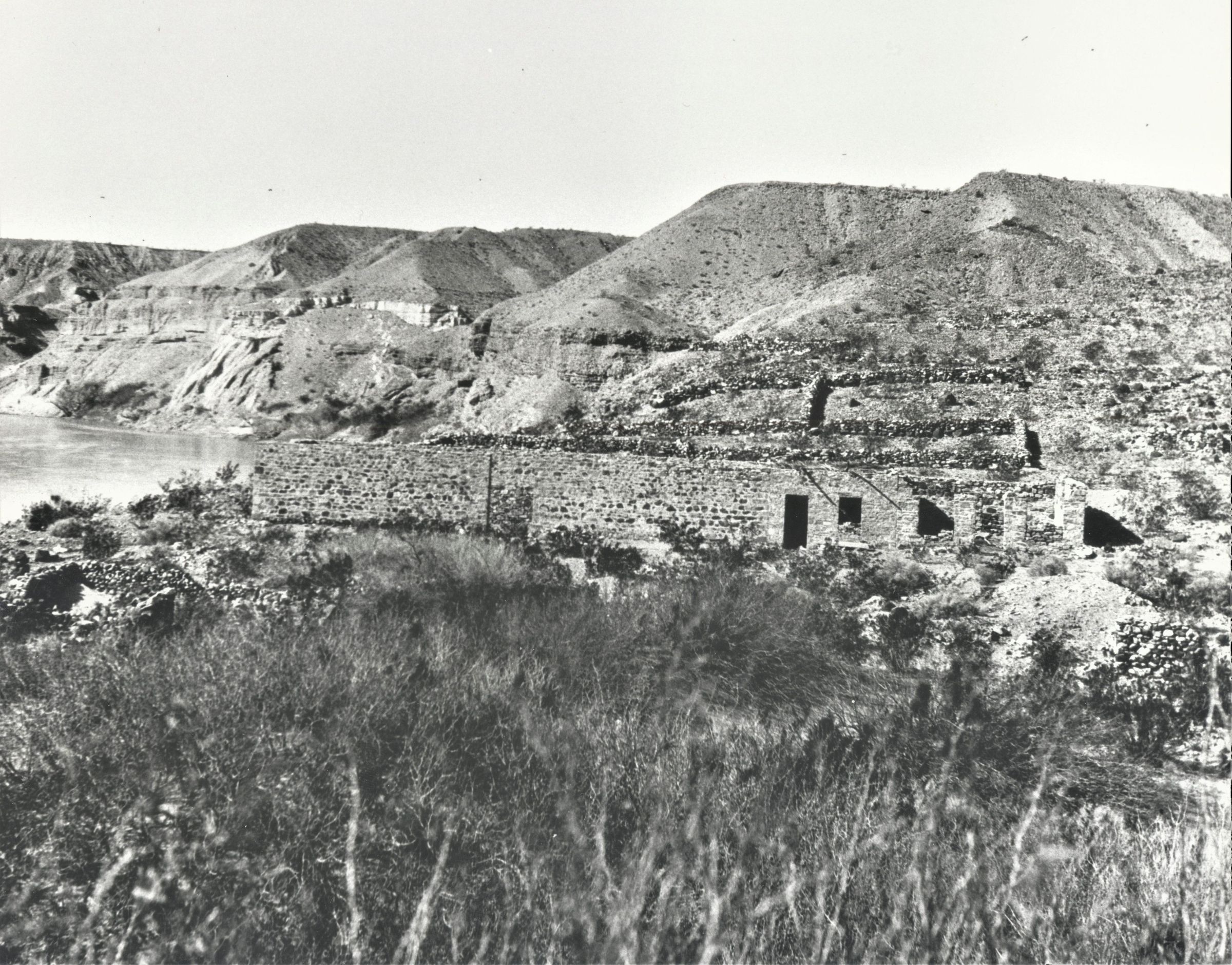 The deserted town of Old Fort Callville looking downstream. Shows largest building. It is about 30' x 120' and built of masonry February 2, 1921; USBR photo-Wash. no. 83; Walker R. Young, photographerCollection