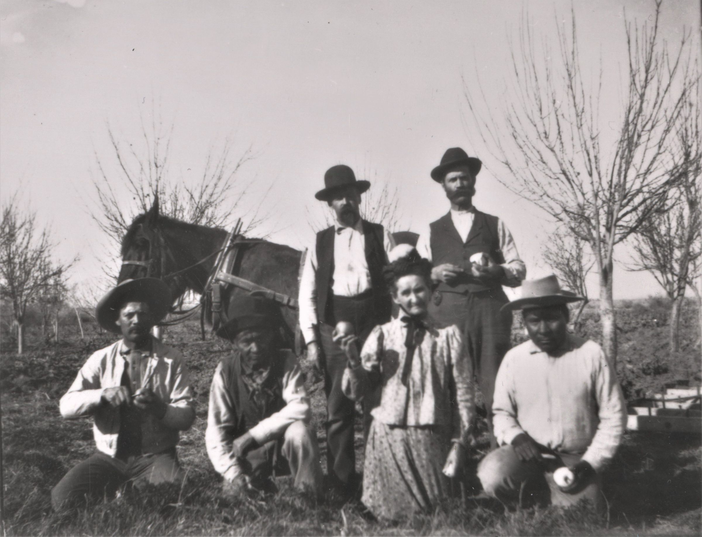 Enjoying apples grown on the Kiel Ranch, ca. 1890s-1900s; note the Paiute/Hispanic men; UNLS, 0105:0105, NV. State Parks CollectionCollection