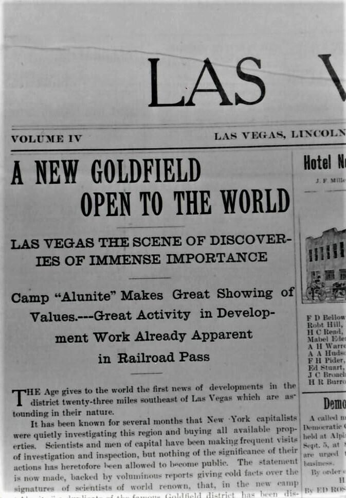 Alunite; NV; c.1908; news stories headlines; Las Vegas Age; September 5, 1908; p1Made/Created