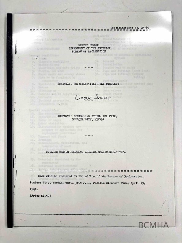 Automatic Sprinkling System for Park, Boulder City, Nevada, Wilbur Square; Schedule, Specifications, and DrawingsEntry/Object ID
