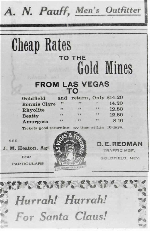 Railroads; Las Vegas; & Tonopah; Railroad; Advertisement; "Cheap Rates to the Goldmines"; Las Vegas Age; Nov. 12, 1912; p.3Made/Created